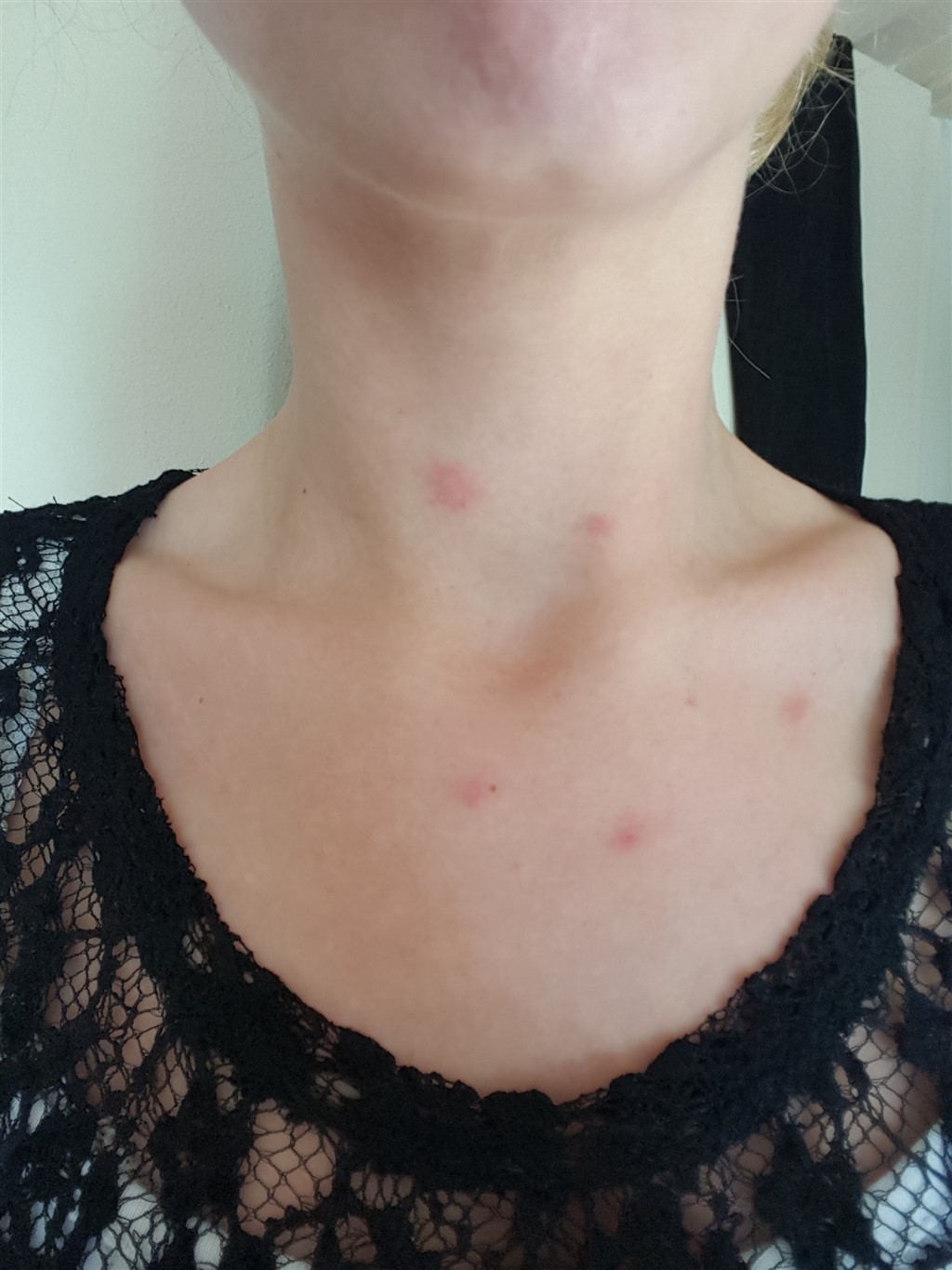 Jeg er her til morgen våget med dette på hals og brystkasse.