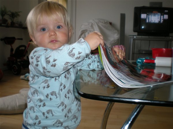 Han er et lille fjolle hoved og har ikke været syg i en uge nu tror jeg det er og han er bare glad. Sover stadig 12 timer om natten. men kun1½ time plus minus til middag og ellers er han vågen hele dagen, det skiftede bare fra den ene dag til den anden, søndag sov han 2 gange om dagen, mandag vil han ikke sove den sidste gang om eftermiddagen mere.