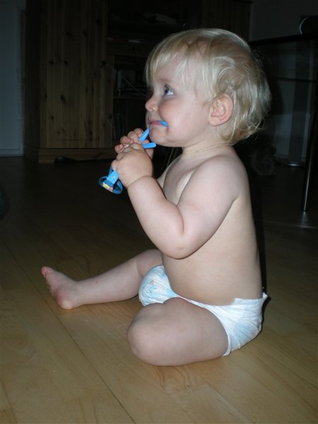 Han får også multivitaminer nu for at se om vi kan få gang i hans udvikling igen med hensyn på vægt og længde. Alt det andet vil jeg sige han er pænt med igen, han kan gå med støtte og kan faktisk gå hvor vi kun holder ham i en hånd indtil det går op for ham man har sluppet ham så sætter han sig på numsen, her tidligere i dag stod han helt selv uden at holde ved indtil han opdagede det så faldt han ned på numsen