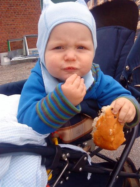 Han sover kun til middag nu. Spiser selv undtagen grød det skal vi stadig give ham, men vil give give ham rugbrød eller lignende så flipper han helt og skælder ud så han gør det selv. Han drikker også af glas selv nu, kun blevet våd engang da han blev lidt for ivrig hehe og mor her vist havde hældt lidt for meget vand i hans glas