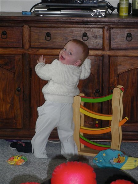 i skrivende stund prøver han nye kræfter af igen. Han gad nemlig ikke blive nede på gulvet, da han fandt ud af at transportere sig selv rundt. Så ugen efter han havde lært at sidde selv, og kravle. Der rejste han sig op (ved en skammel tror jeg) og siden har han selv fundet ud af, at man kan gå lidt rundt om borde og stole. Og han er så småt begyndt at prøve med diverse gåvogne også.