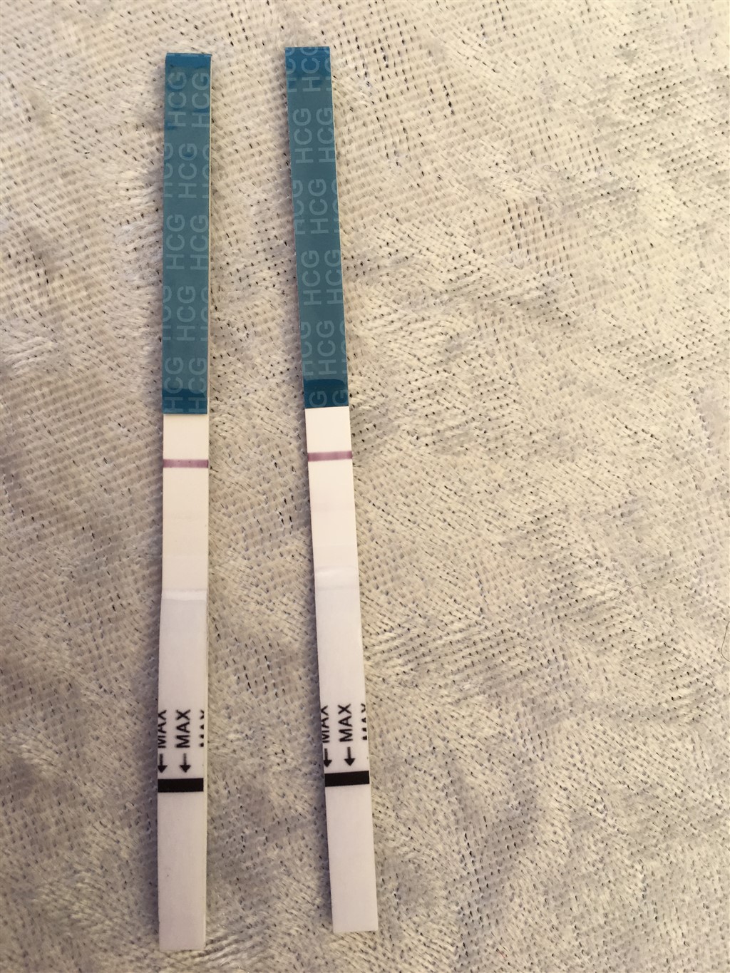 som du kan se på mine første tests, er stregerne jo ultra svage og kan være svære at tyde, på trods af at noget faktisk kan ses... Den tålmodige person havde nok bare ventet at se hvordan de udvikler sig, men sådan en person er jeg ikke