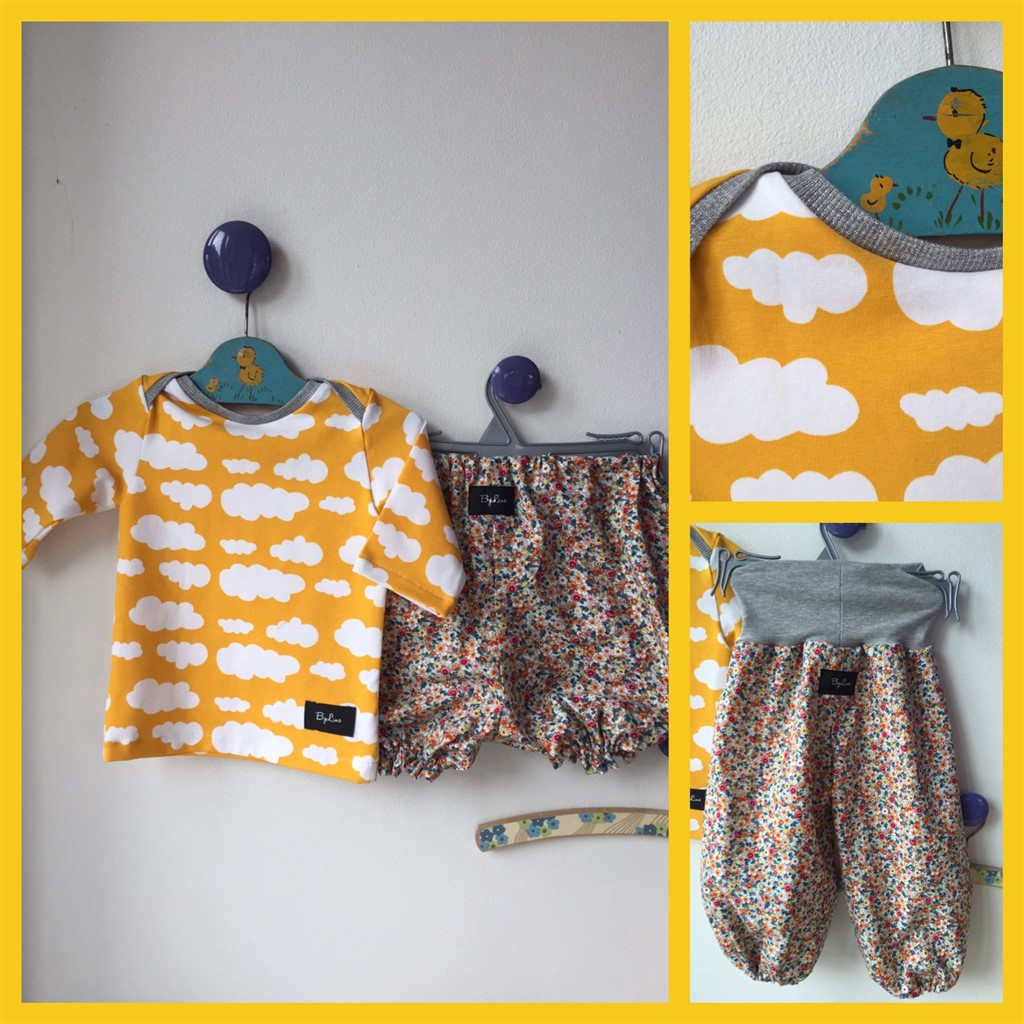 er sommer/sensommersæt til pigen str 74-80 (1 år). Bluse med trekvart ærme, bloomers og Tullebukser. Hele sætter 150 kr pp