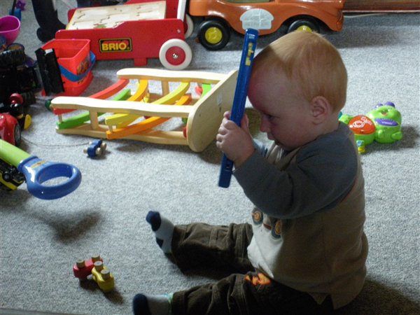 Lige nu sidder han og leger den leg med sig selv.... Og det foregår ved at han tager Bastians tegneplade-dims op foran hovedet, mens han siger 'Ah ah ah ah'... og girner ind imellem.... Det er altså meget hyggeligt at se på....