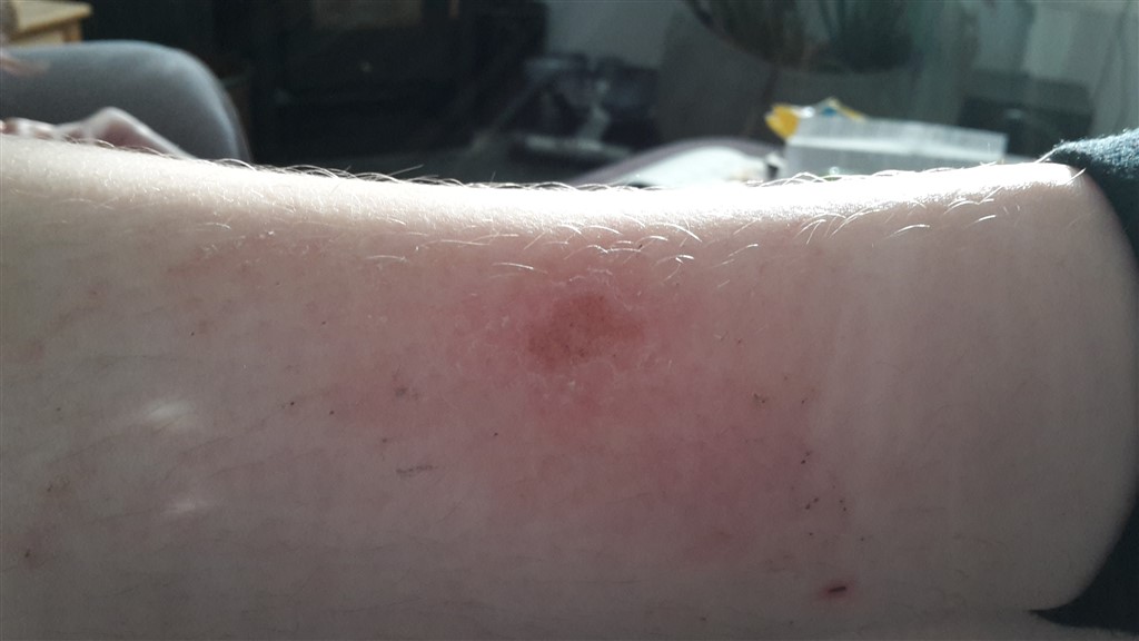 Det gør ikke ondt eller klør men hun fortæller at det ikke rigtig danner skorpe. Det er noget gult i selve såret og rødt udenom.