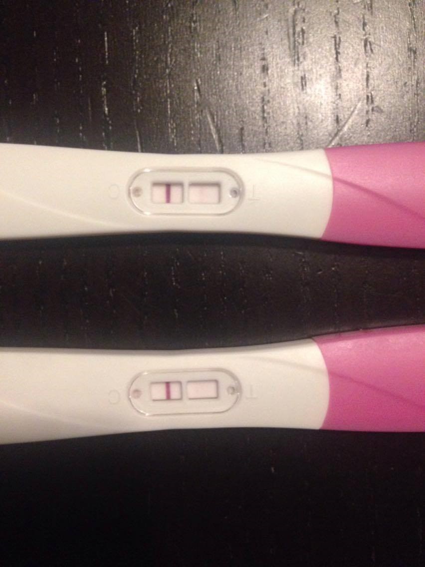 Jeg bliver simpelthen nødt til at dele mine to tests fra i morges og her til aften! De i morges troede jeg først var en fejl, så nr to meget utydelig streg kom først senere, og anden test er der ingen nummer to streg på