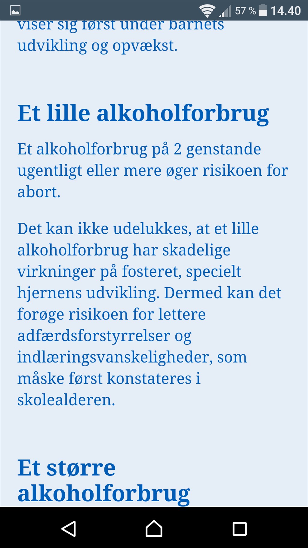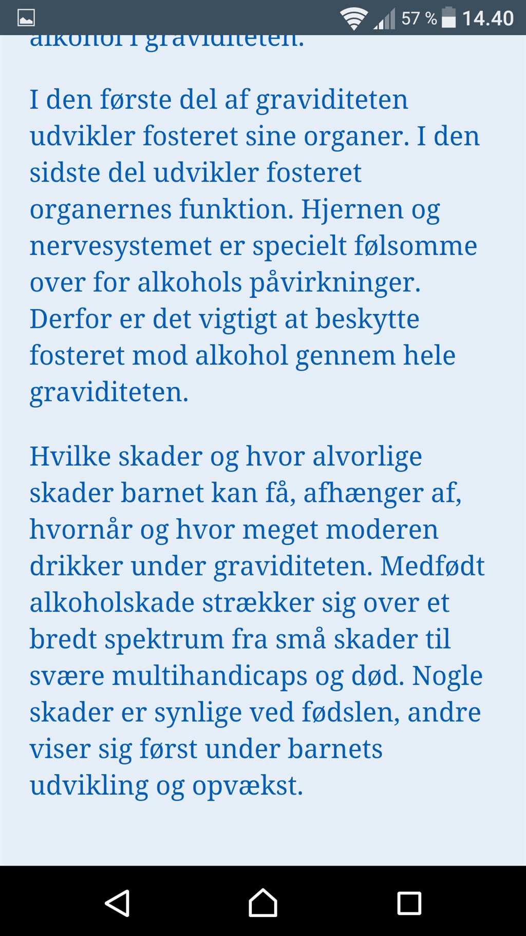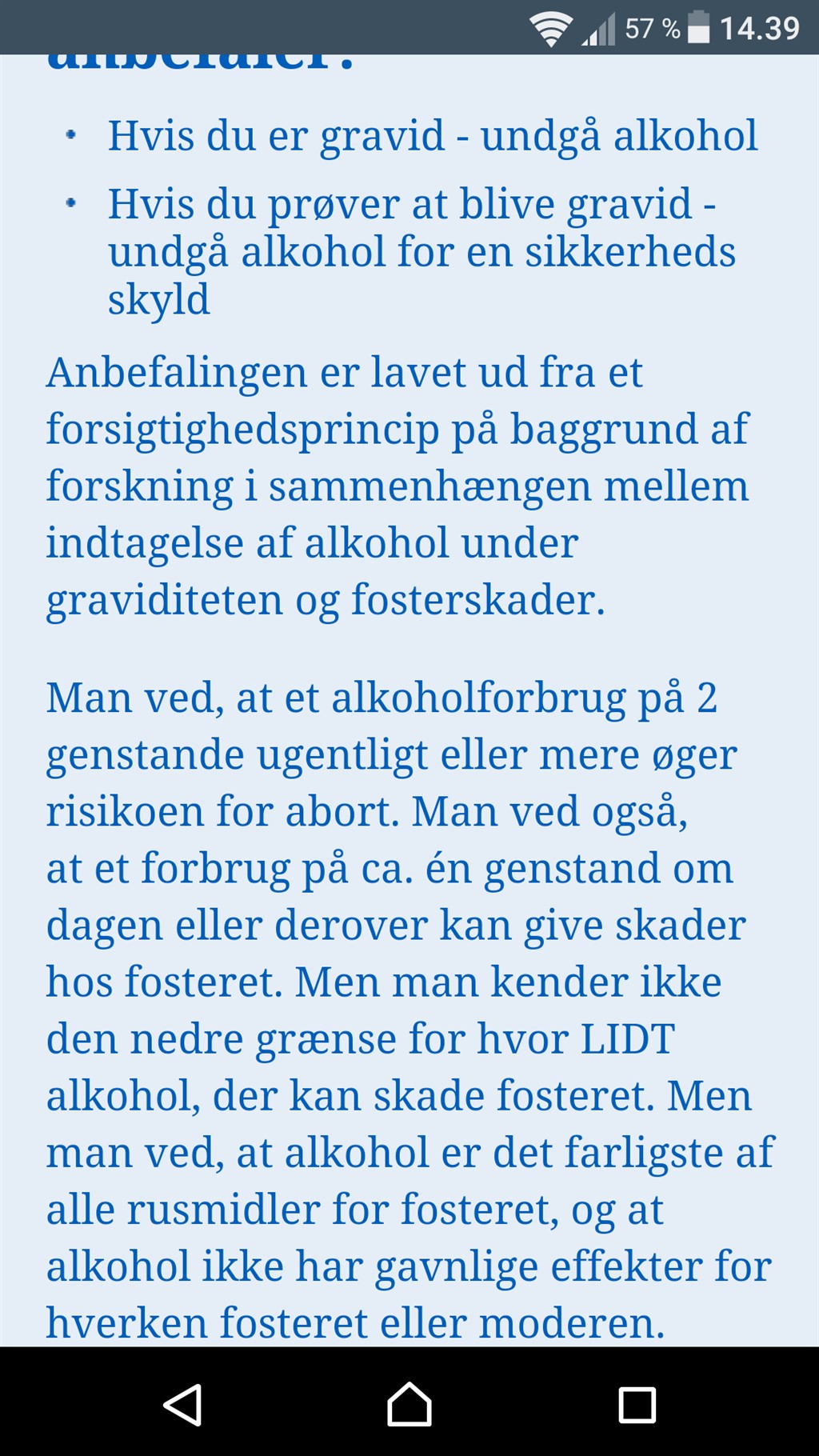 Jeg tænker bestemt godt, at man kan tage et glas i ny og næ. Nogen siger et helt glas andre et halvt om ugen, men i princippet tror jeg bare, at man skal tænke over, at man har et lille foster inde i maven, som man deler blod med, og som bliver noget nemmere påvirket af alkoholen end vi selv gør. Så det der med at holde, når vi selv kan mærke noget, virker ikke. Så er det for sent.