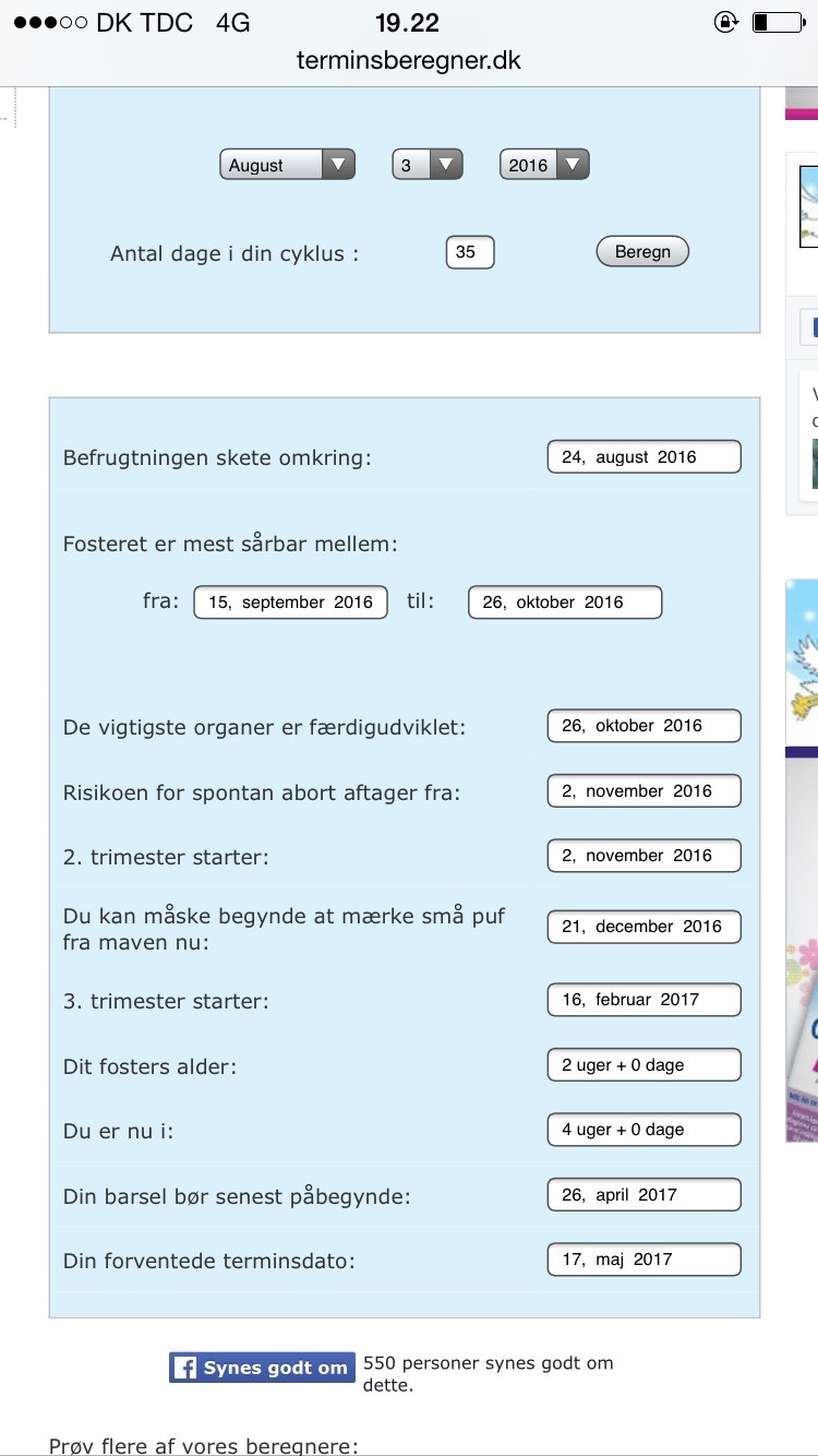 Jeg har læst mig frem til, at lægerne går efter sidste menstruations første dag, hvilket var 3. August for mig, men min cyklus er på 35 dage og jeg tog en positiv ægløsningstest d. 22 August.