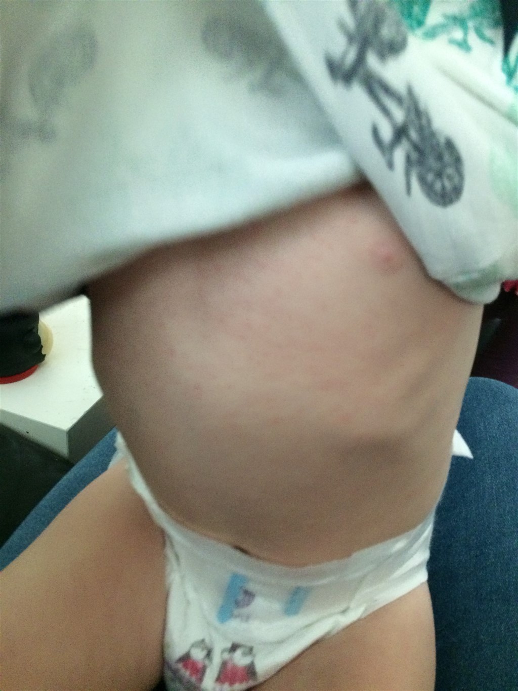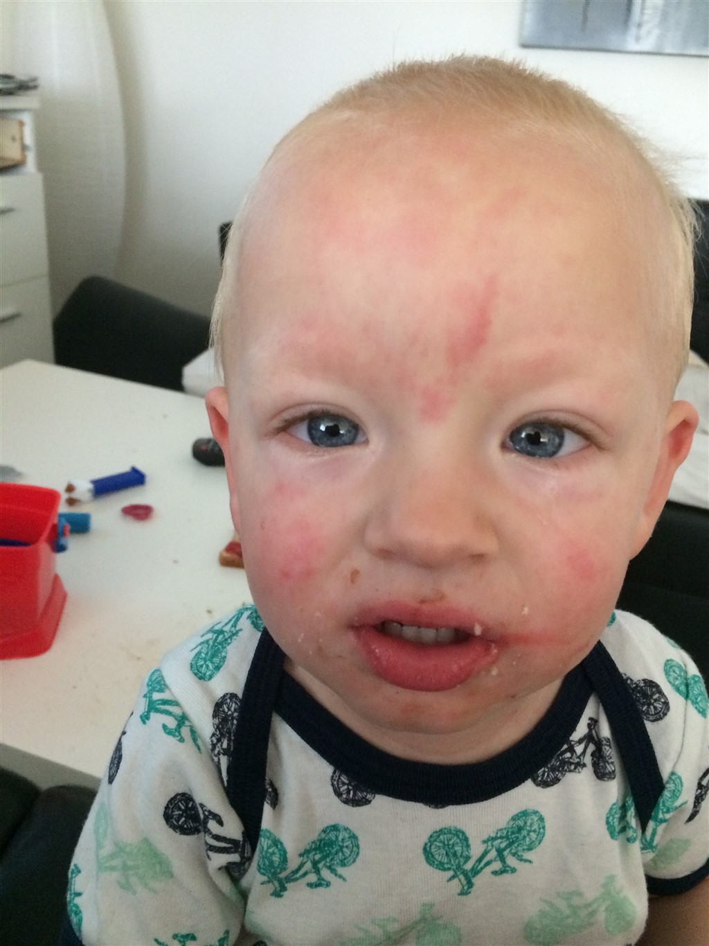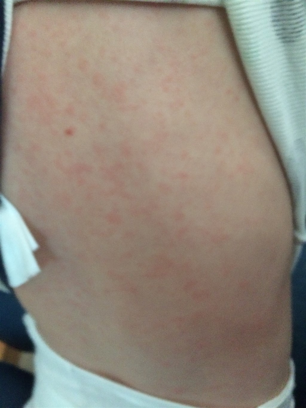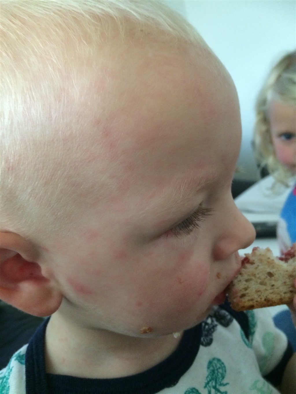 vores søn har haft feber onsdag og torsdag. Fredag var feberen væk men han var stadig meget sløj og i dag ser han så sådan her ud. Pletterne er kun i hovedet og på mave og ryg. På hans arme og ben er der ikke noget.