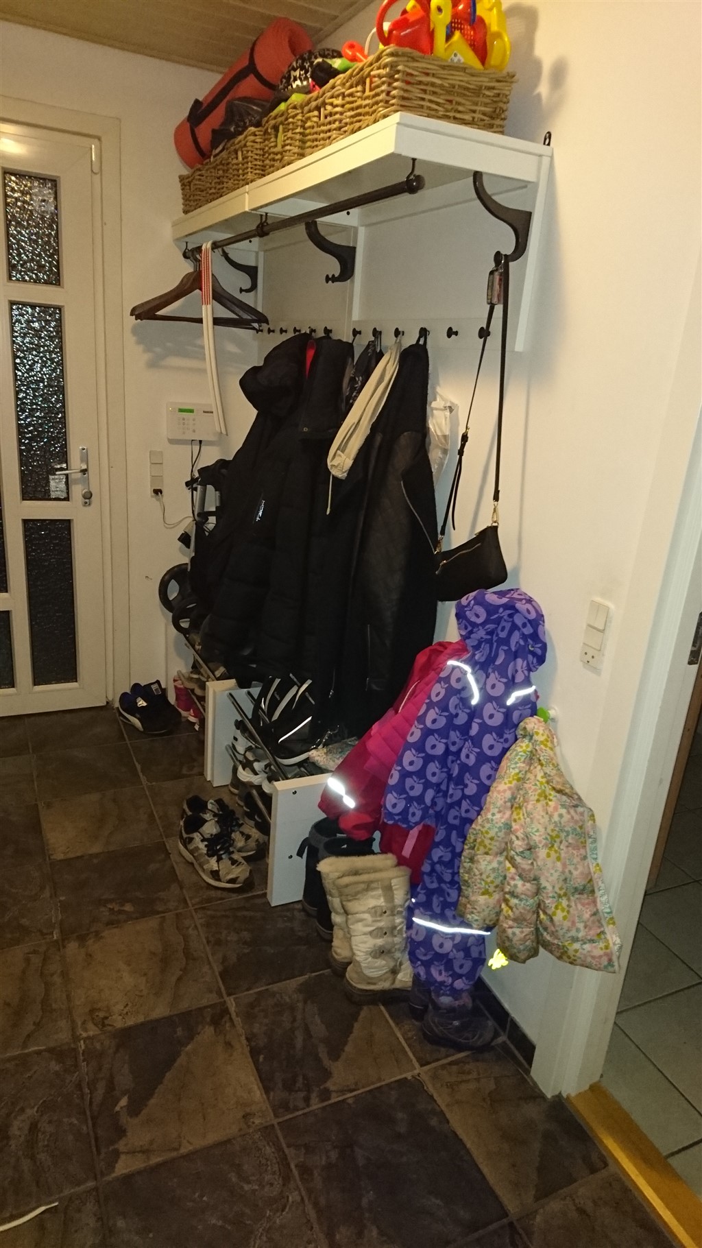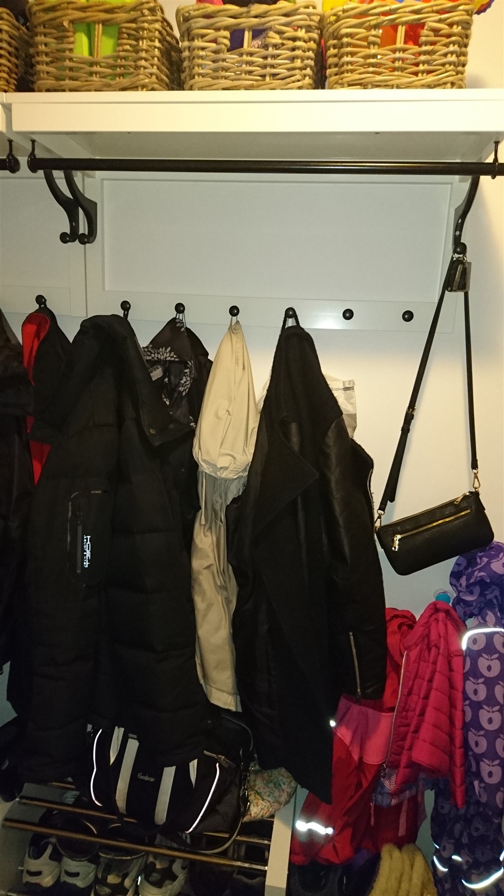 Vi har lige købt hus, og nu skal jeg til at være kreativ på en smal væg hvor der skal hænge jakker og tasker...