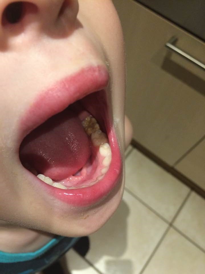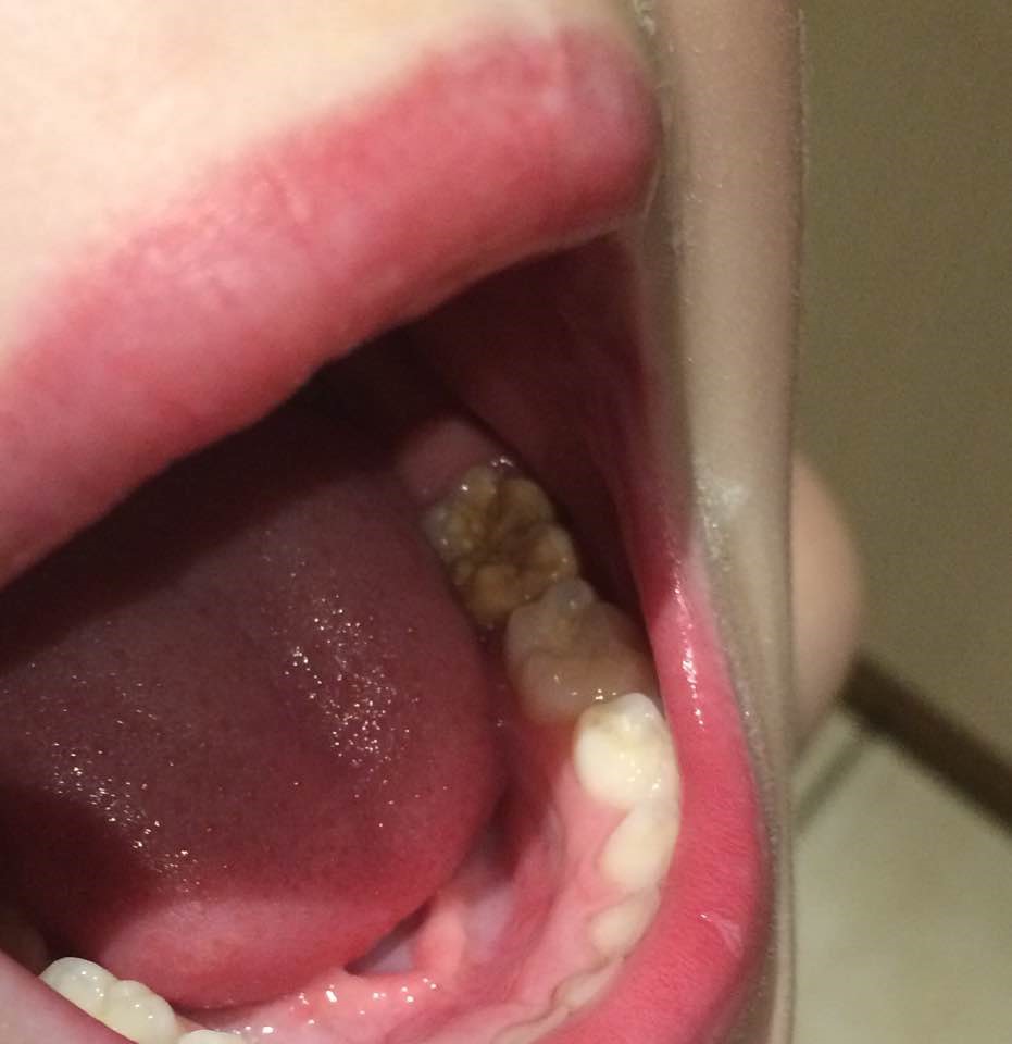 Men hans ene kindtand ser underlig ud? Den er gullig og han mener den isner - hvad er der da i vejen med den?