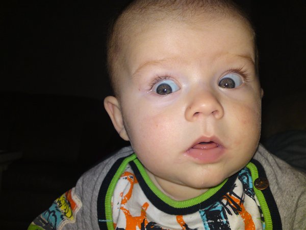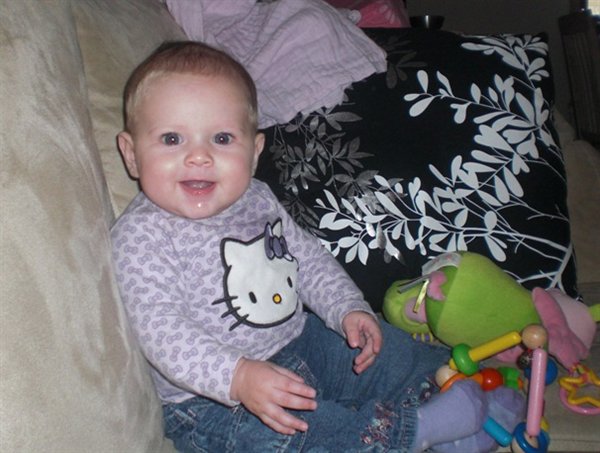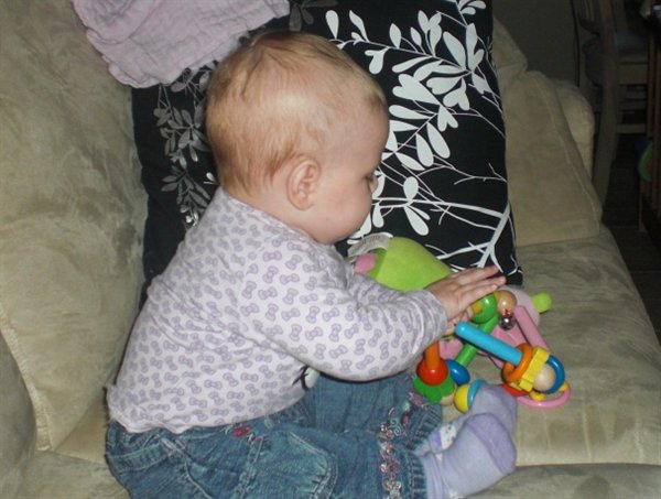 CELINA sidder og hygger på sofaen. Hun er begyndt at sidde kort tid uden støtte ......og hun er vel og mærke stadig kun 4 måneder