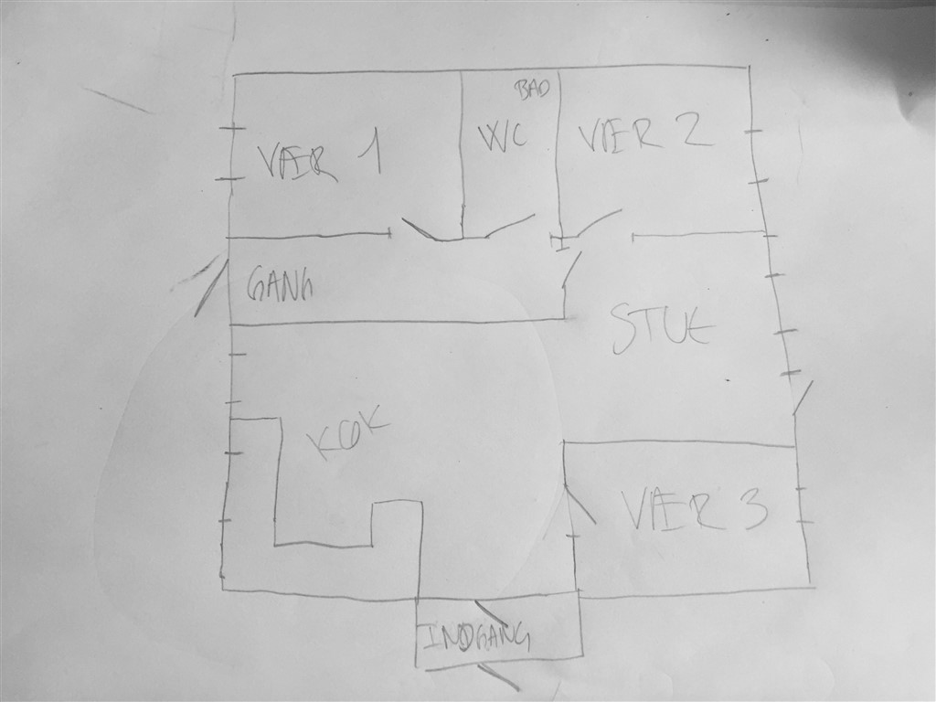 Lige nu er værelse 1 brugt til tøjskabe og krea opbevaring, værelse 2 er forældresoveværelse og værelse 3 er min søns. Gangen bliver i øvrigt ikke brugt som ind eller udgang selvom der er dør, dyrene, 2 hunde og 3 katte har fodreplads, kradsetræ og kattebakke derude.