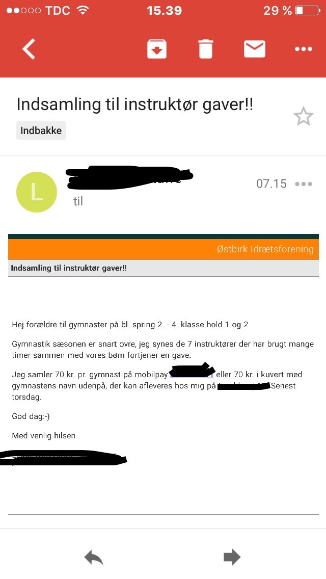 Hvis det var mig, der stod for det (og det kunne jeg som sådan sagtens finde på), så havde jeg formuleret det helt anderledes (ved at understrege det frivillige aspekt), og så havde jeg i øvrigt ikke "holdt styr på", hvem der havde overført, men havde blot overrakt gaven som en samlet gave fra hele holdet - uanset hvilke navne, der var skrevet på de individuelle kuverter.