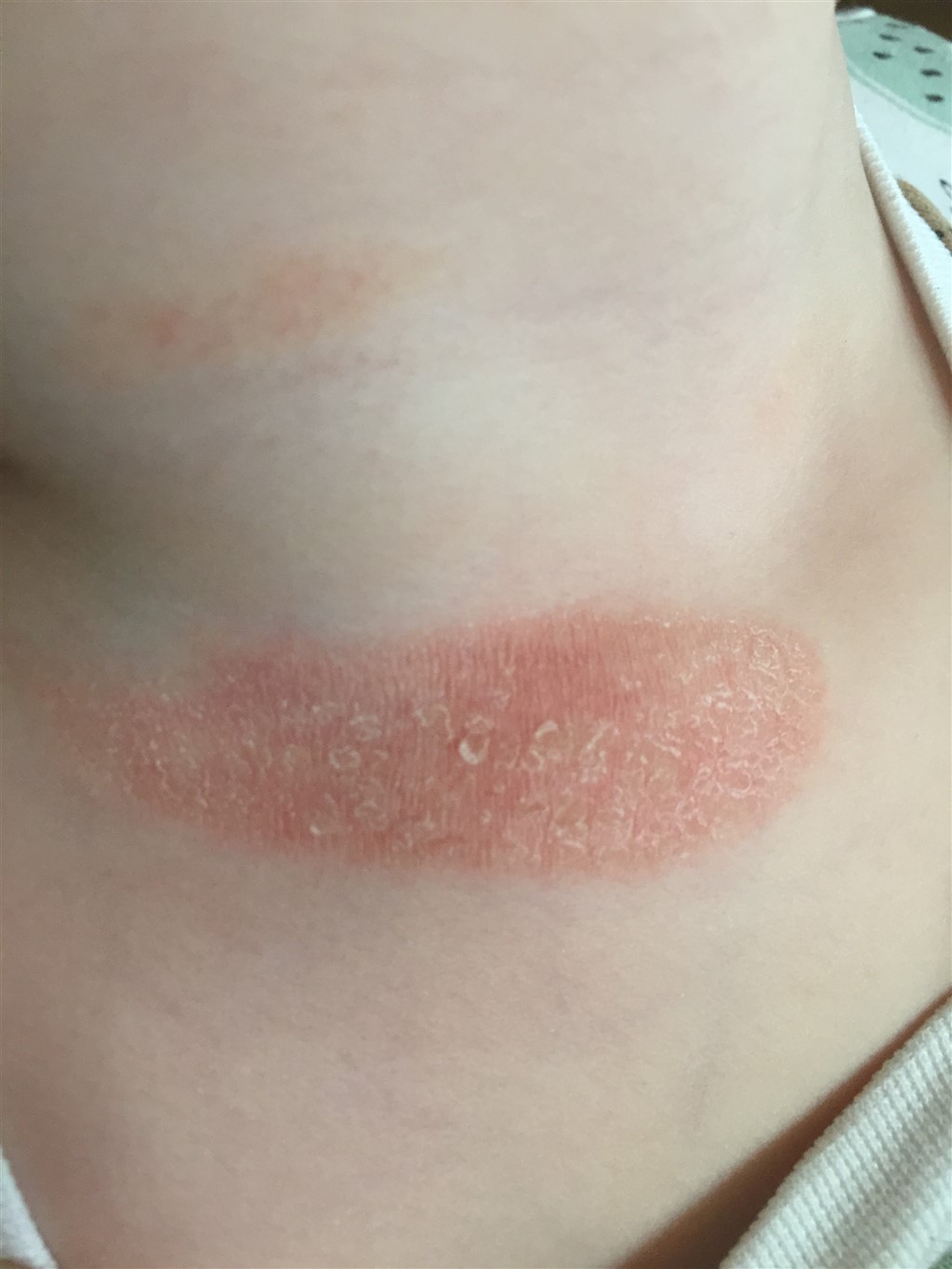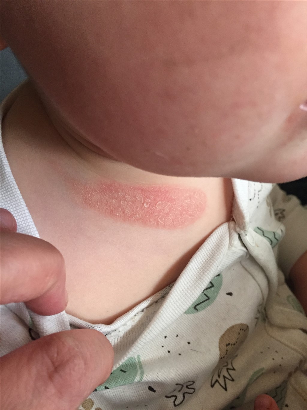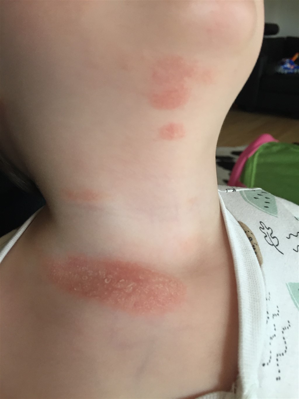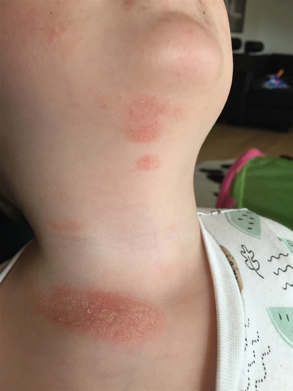 Hun fik lige pludselig enormt tørre områder på kroppen i nogle mærkelige 'mønstre'. Jeg døjede selv med atopisk eksem som barn og det skulle vist (er slet ikke sikker) være arveligt.
