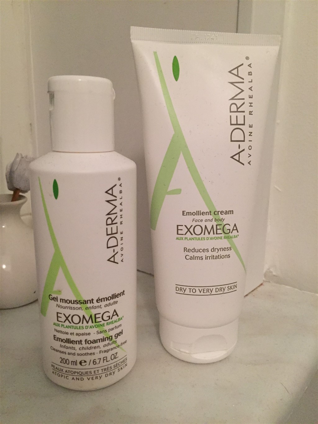 Vi fik anbefalet en creme og en sæbe til bad fra Aderma. Jeg vedhæfter lige et billede.