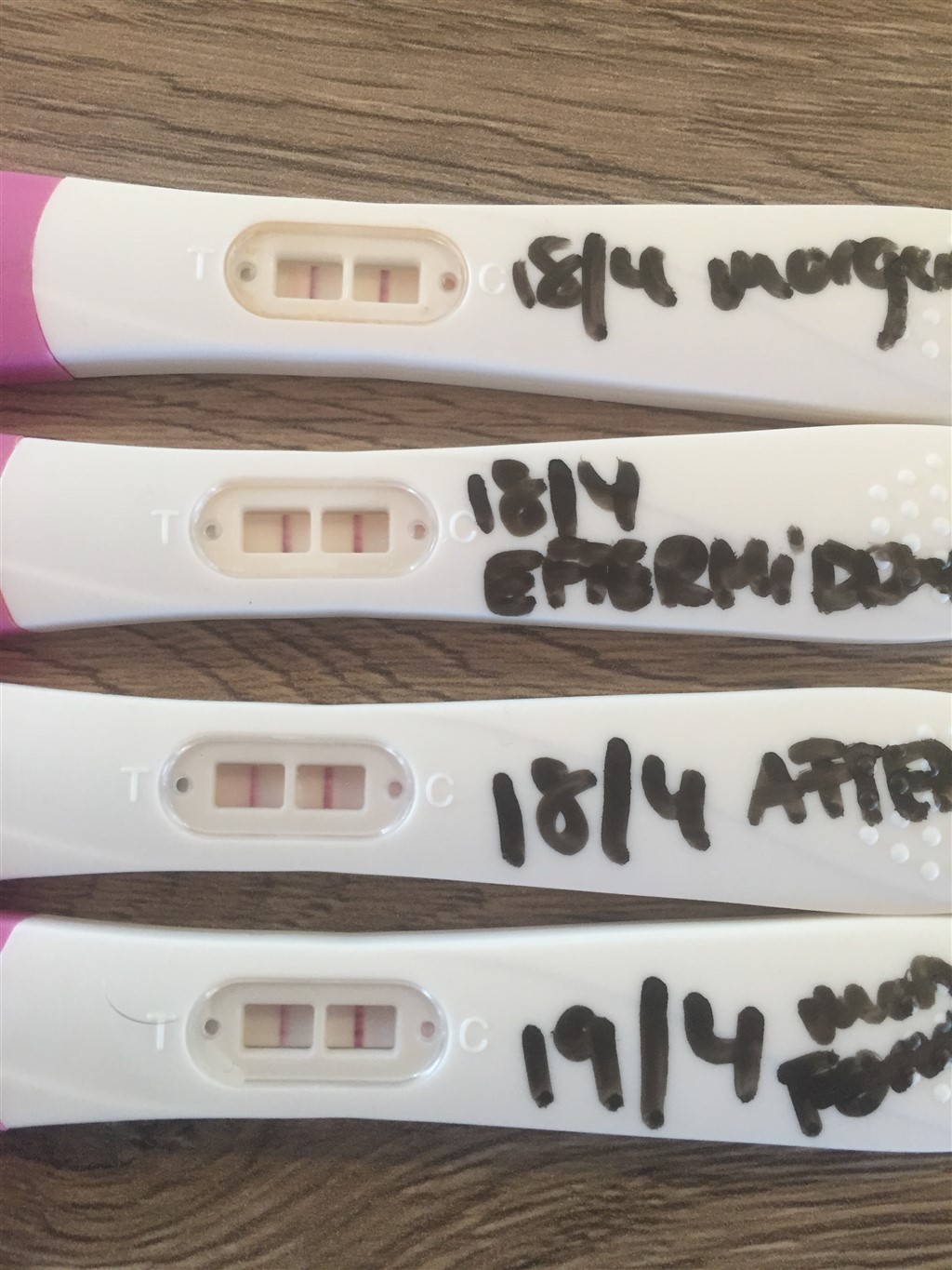 Når det er ægløsningstests, så er de allesammen negative, for selvom teststregen er tydelig, så er den ikke helt så kraftig som kontrolstregen, og ved ægløsningstests skal teststregen være kraftigere eller mindst lige så kraftig som kontrolstregen for at være positiv, og det er dine ikke. Dog ligner de mine 1-2 dage før jeg får en positiv ægløsningstest, så vil tro du kan få en positiv test en af disse dage. Og når du så tester positiv går der jo 12-36 timer før du har ægløsning.