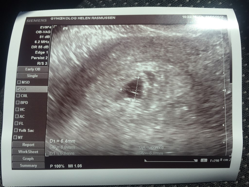 Jeg er SÅ glad! De fandt en fin lille blommesæk på 6,8 mm og måske antydningen af et foster. Hcg var steget til 8500. Det er langt mere, end hvad jeg havde turde håbe på.