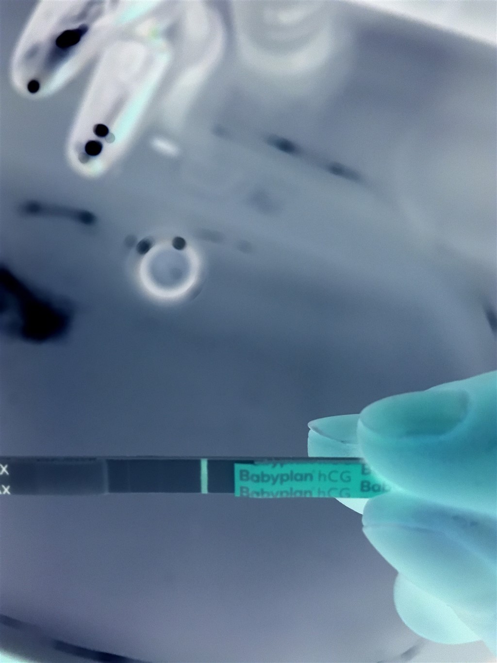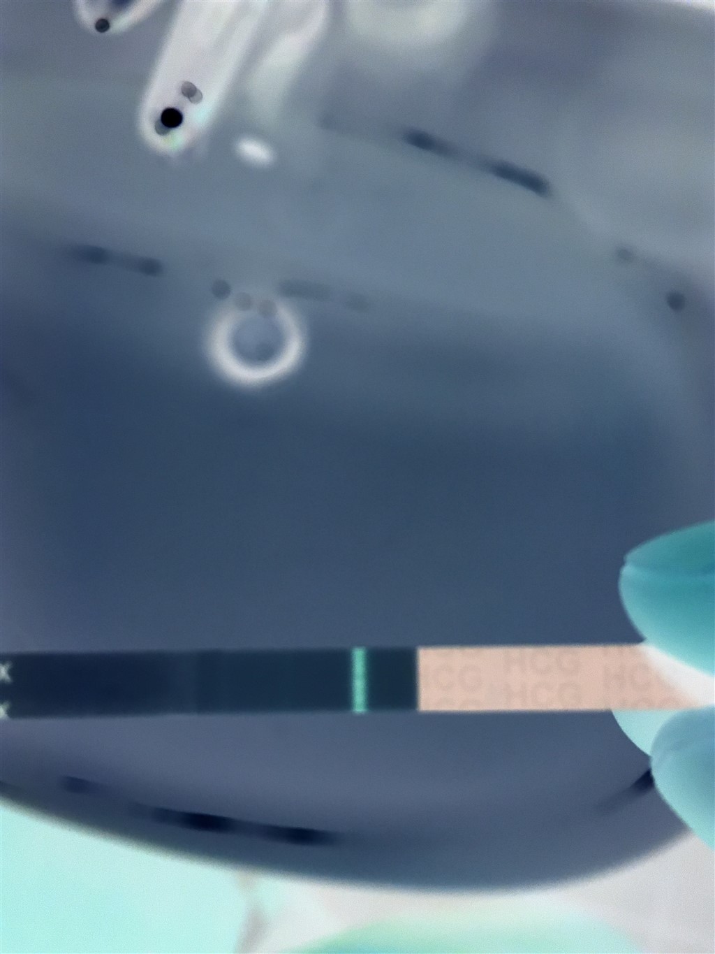 Jeg tog en test af samme type som i går (den ekstra følsomme) samt en almindelig strimmeltest. Kunne dog kun tage den efter tre timer, da det var så længe jeg max kunne holde mig i nat (i dagtimerne i gør tissede jeg mindst en gang i timen), så det var selvfølgelig ikke så koncentreret, som det gerne måtte have været.