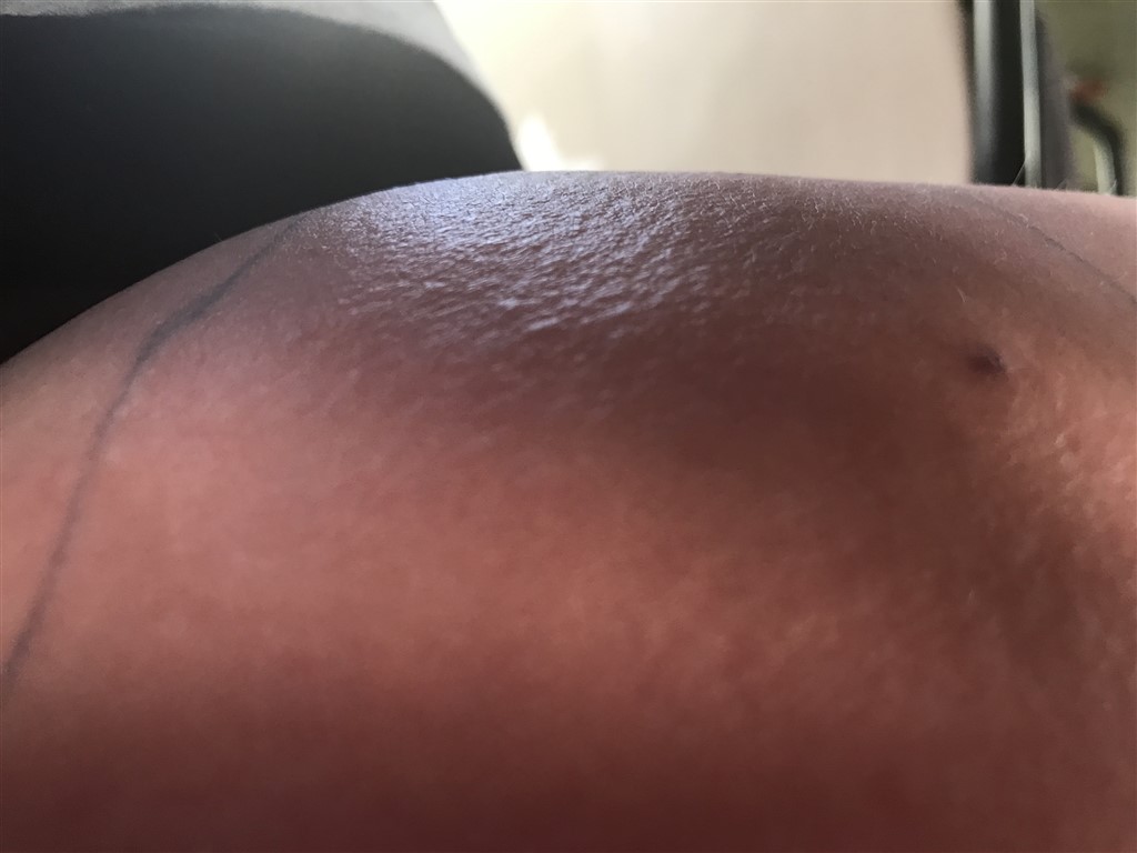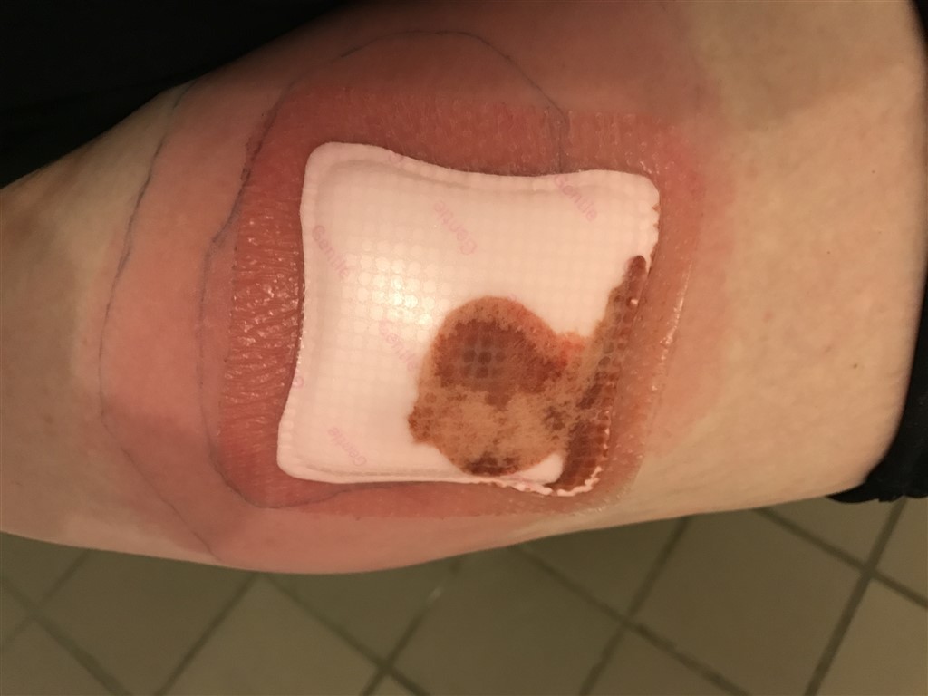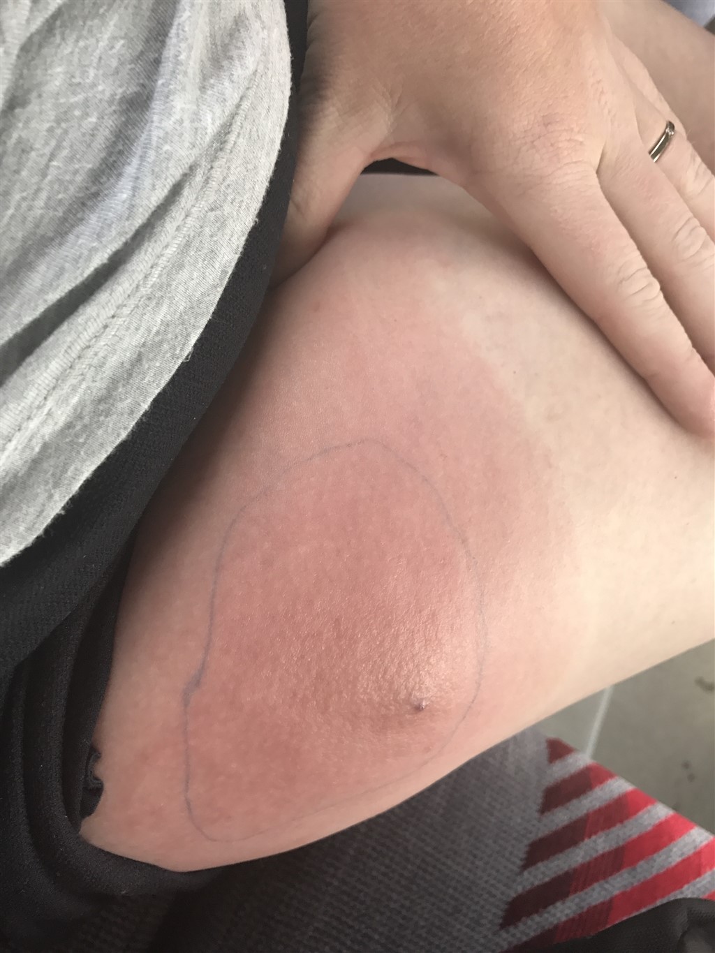 Efterfølgende ser jeg et blåt mærke og en lille bule øverst på højre lår men tænker at det nok er normalt.