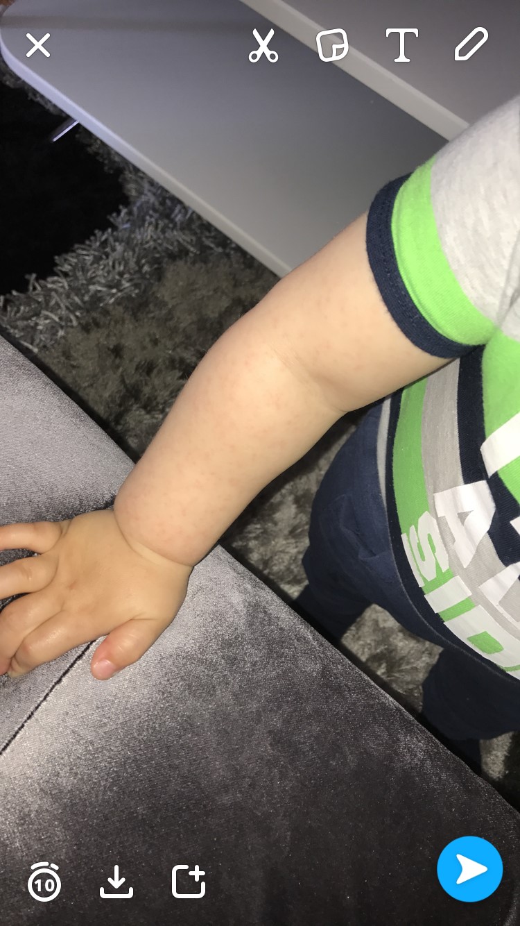 der kommer udslæt når barnets feber falder nemlig. Passer også på inkubationstiden