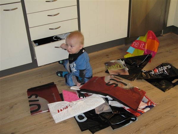Ellers bøfler han bare rundt herhjemme og er allesteder. Her til morgen tømte han stort set hele skuffen med plastikposer (puuuh vi har da vidst for mange poser....)
