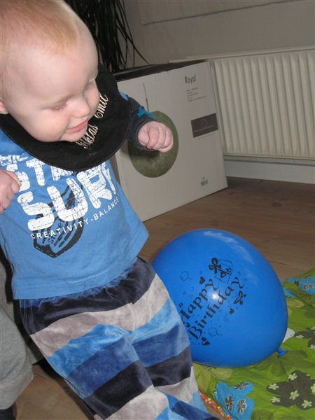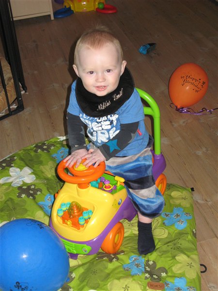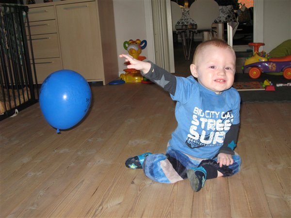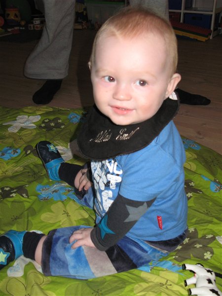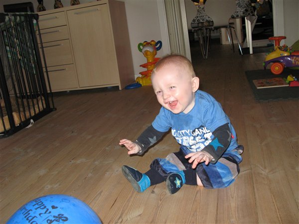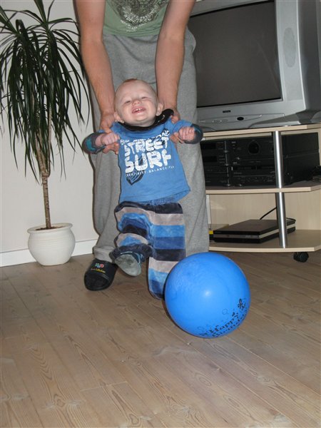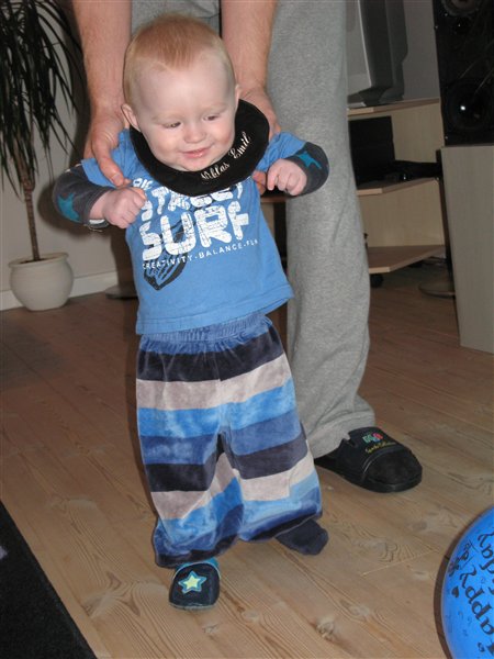 Han vil også gerne gå rundt hvis vi holder ham og ser han en bold på gulvet går han helt amok. Der er slet ingen tvivl om at Niklas Emil blir en fodbold-freak. Han kan allerede diverse tacklinger. Dog tror jeg også han har en karriære indenfor militæret for han marcherer afsted som en lille soldat med strakte ben og i takten; 1, 2, 1,2,1,2.... og ja så kryber han jo som nævnt rundt som en lille jægersoldat!