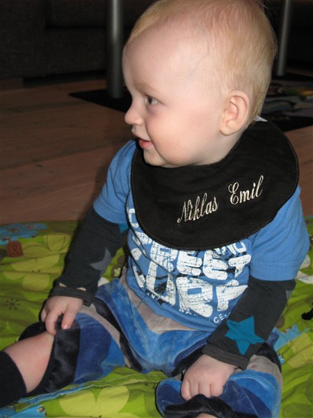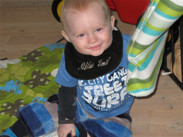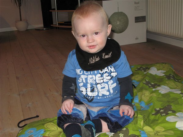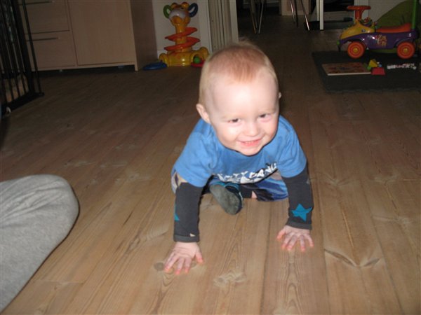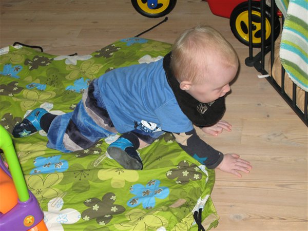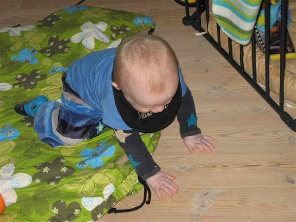 Niklas Emil kryber stadig - Han forstår vidst ikke helt fidusen i at kravle, men her i løbet af denne uge er han begyndt at sætte sig op. Altså fra at ligge på maven og så skubber han sig nærmest op. Nu er han så begyndt at rumpe sig fremad og vupti så ned på maven igen og kryber afsted hvorefter han sætter sig op, drejer lidt rundt og rumper så videre. Af og til ender han også i kravlestilling og Morten sagde at han igår vidst tog to kravle-bevægelser!