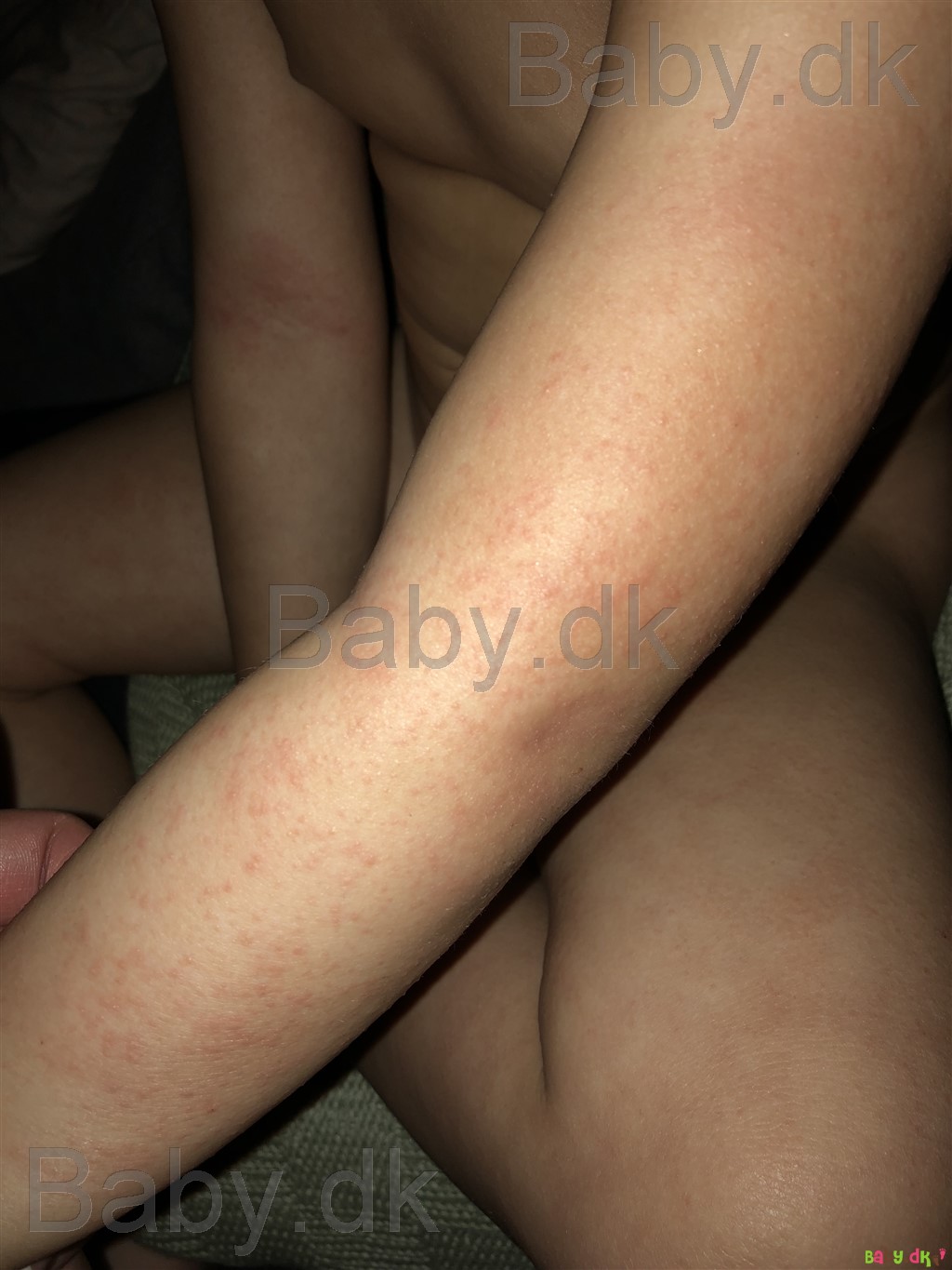 Jeg har en datter på 3 år, som bliver ved med at få udslæt på hele kroppen. Mest på underarmene, siderne af ryggen og nederst på lænden, men generelt lidt over det hele. Se billeder for udseende af udslættet.