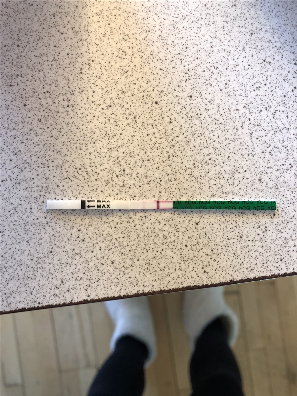 Sagtens! Den er klart positiv. Måske tror din mand, at stregerne skal være lige tydelige? Du kan jo vise ham brugsanvisningen, hvor der står, at hvis der er to streger, så er testen positiv - uanset hvor tydelig teststregen er.