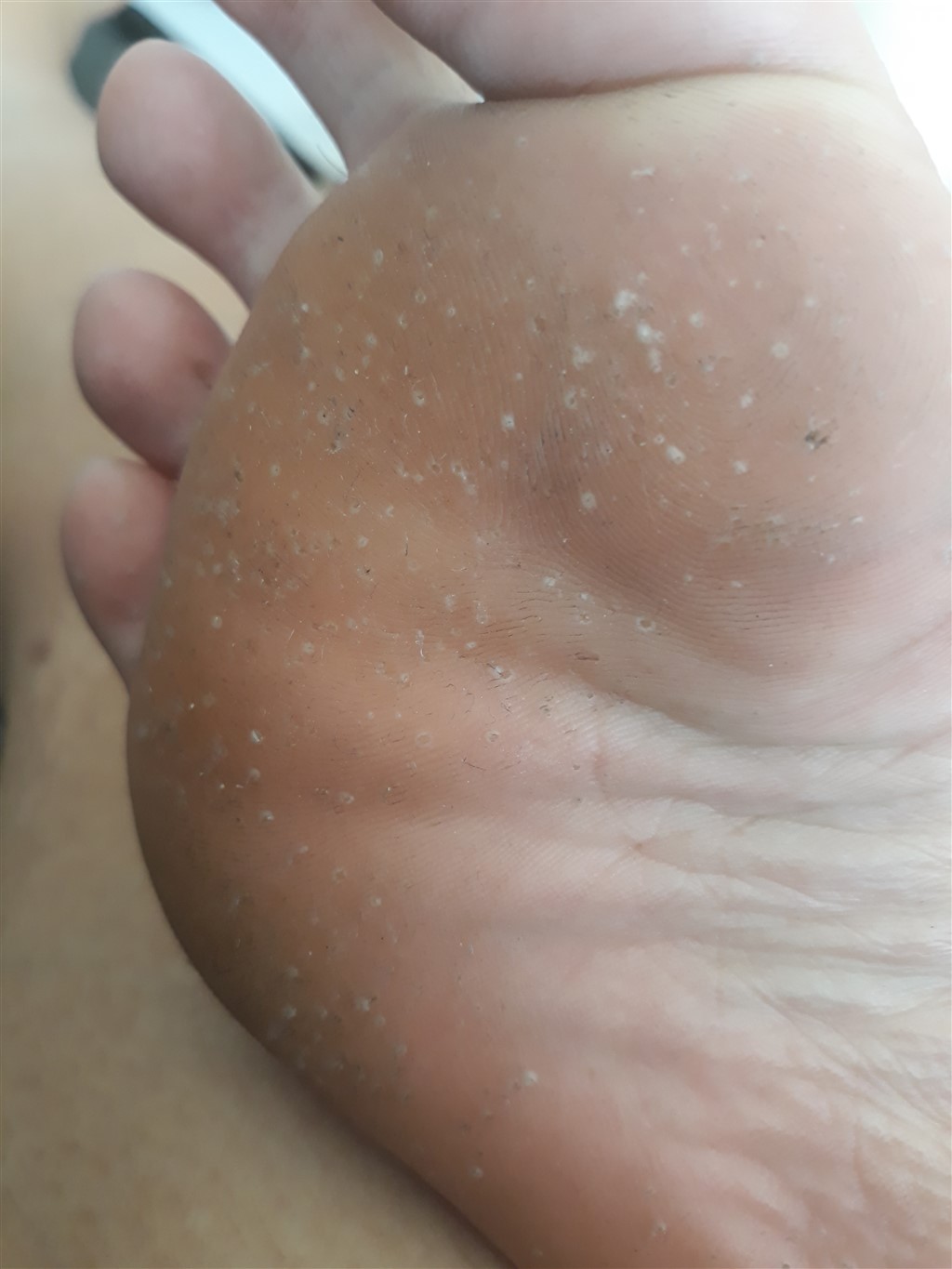 Det ligner bare lidt død hud eller hvad kalder man det. Jeg får det omkring negle og også lidt under fødderne hvis jeg feks har fået i varme sko og huden ligesom har gnubbet på skoen. Men måden det er fordelt på ser lidt sjovt ud. Jeg får bare en eller 2 større plamager.