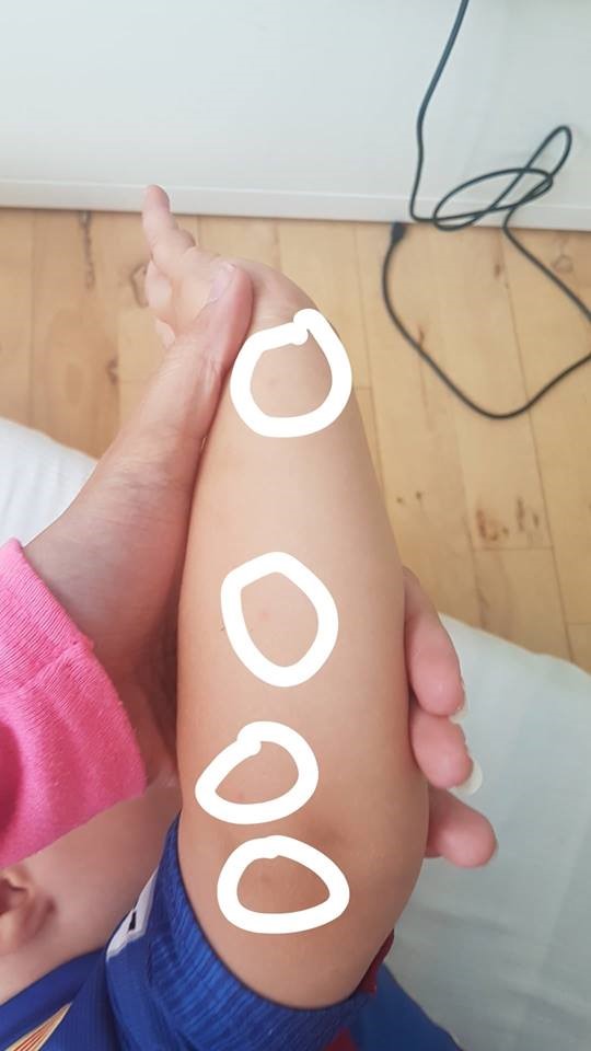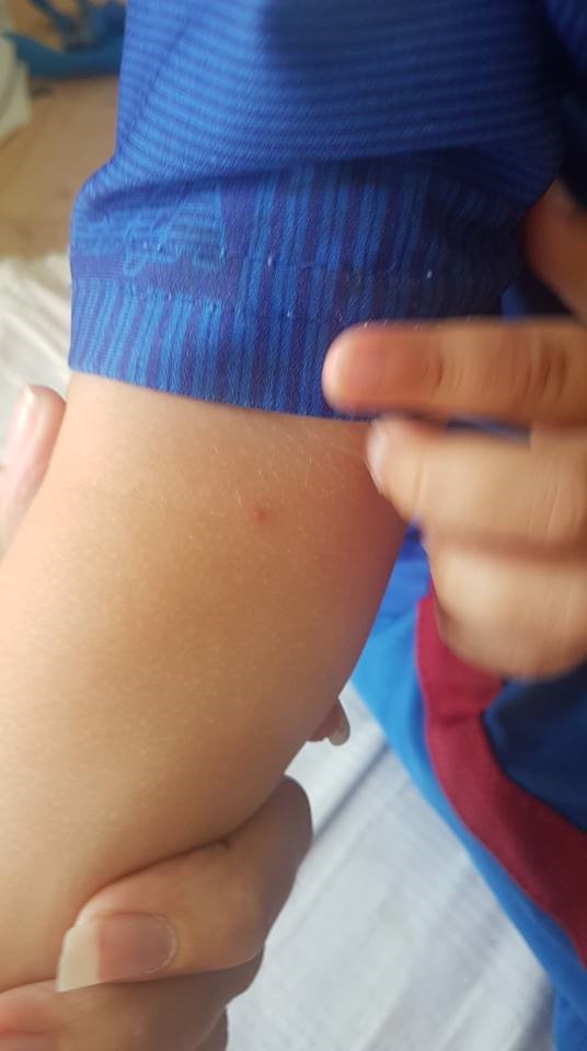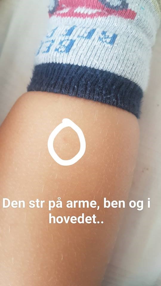 Han vågnede op med 3 røde prikker i hovedet, et par stykker på armen og benet.
