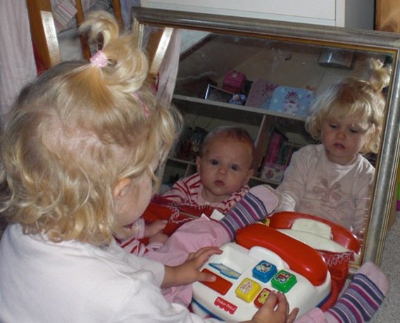 Bianca er lige blevet 2 år, og hun er ihvertfald MEGET BEVIDST om, at det er hende selv hun ser i spejlbilledet, når hun gøgler rundt