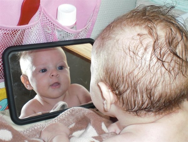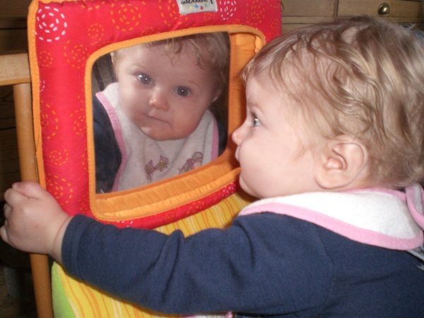 Celina er lige knap 5 måneder gammel nu. Hun har længe været begejstret, og smilet stort, når vi står foran spejlet. Men jeg tror nemlig ikke hun har den fjerneste idé om, at det er hende selv hun ser derinde.