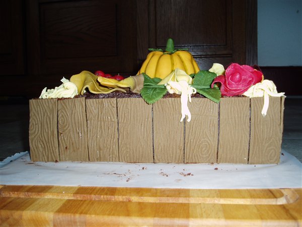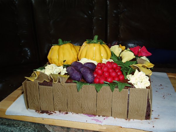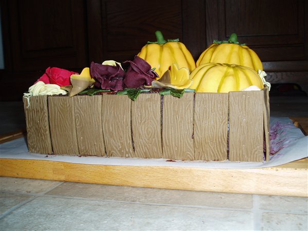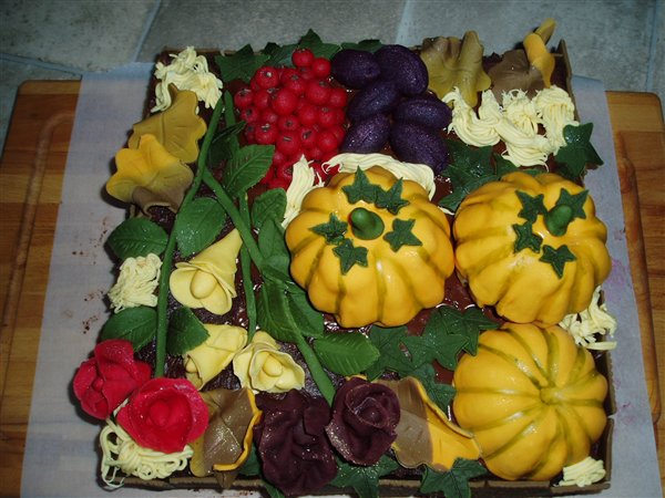 Kagen måler 25X25cm - bagt som chokoladekage og delt i 3 med tynd dekorationsståltråd. Lagene er creme af piskefløde, blåbær og hindbær. Kagen er smurt op med chokoladesmørcreme med appelsinpasta i og beklædt med hjemmelavede brædder lavet i indfarvet fondant. Ribs og svesker er lavet i marcipan. Græskarerne er bagt i 3D for - smurt op med chokosmørcremen og dækket med indfarvet fondant. Blomster og blade er lavet i indfarvet fondant.