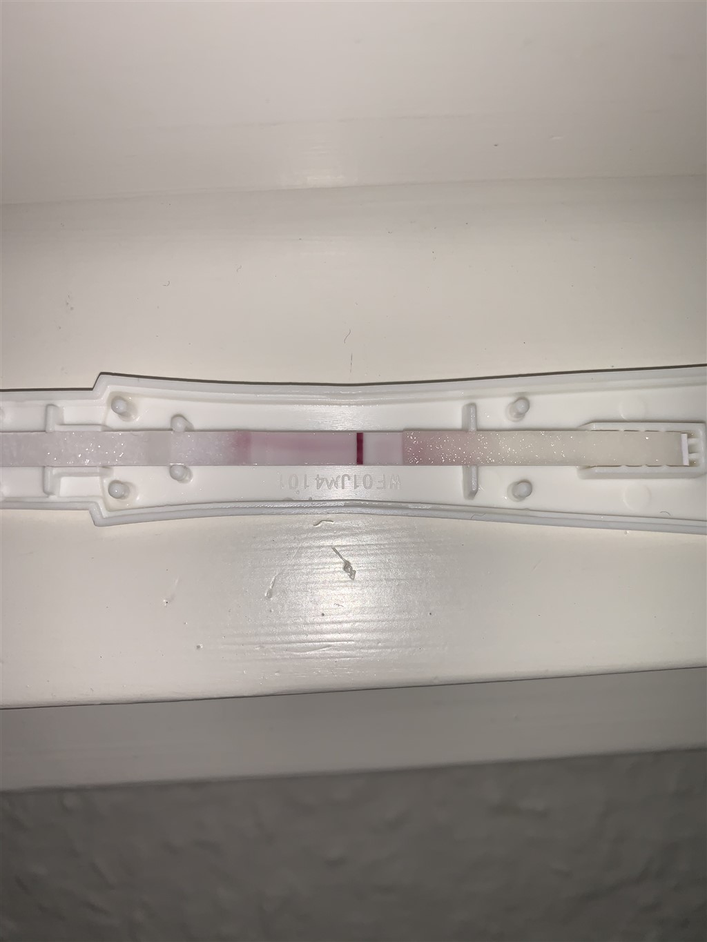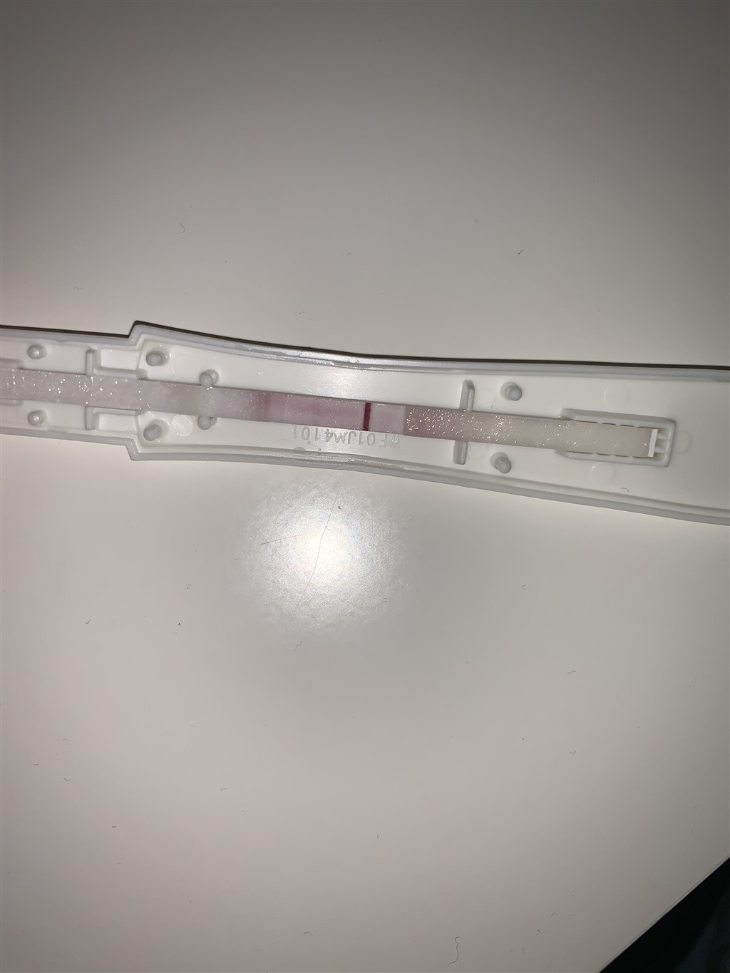 der kom en utydelig streg inden for tid, men er blevet mere synlig efter den har fået lov at tørre ind.. ved ikke om jeg kan tro jeg er gravid eller ej.. kan i se farve i stregen eller er det mon skygge stregen?