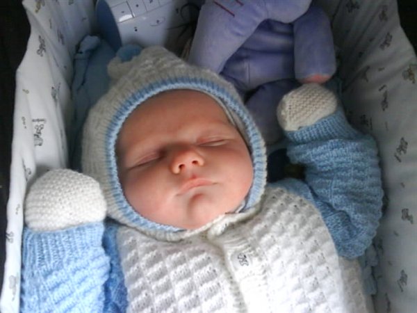 Lige nu ligger han og sover udenfor og babyalarmen viser 15 grader inde ved ham. Som fotoet viser har han en strikjakke, vanter, bomulshue og futtter på. Så er dynen pakket godt ned om ham + jeg lige har været ude og pakke et vattæppe om dynen også, da jeg synes han var lidt kold under jakken (men jeg står jo og hundefryser når jeg tjekker så har dælme svært ved om det er mig eller ham jeg egentlig kan mærke - hvis det gav mening). Jeg har sådan en heldragt til ham, men er bange for at hvis jeg propper ham i for meget tøj nu så vil han komme til at fryse når det bliver endnu koldere.