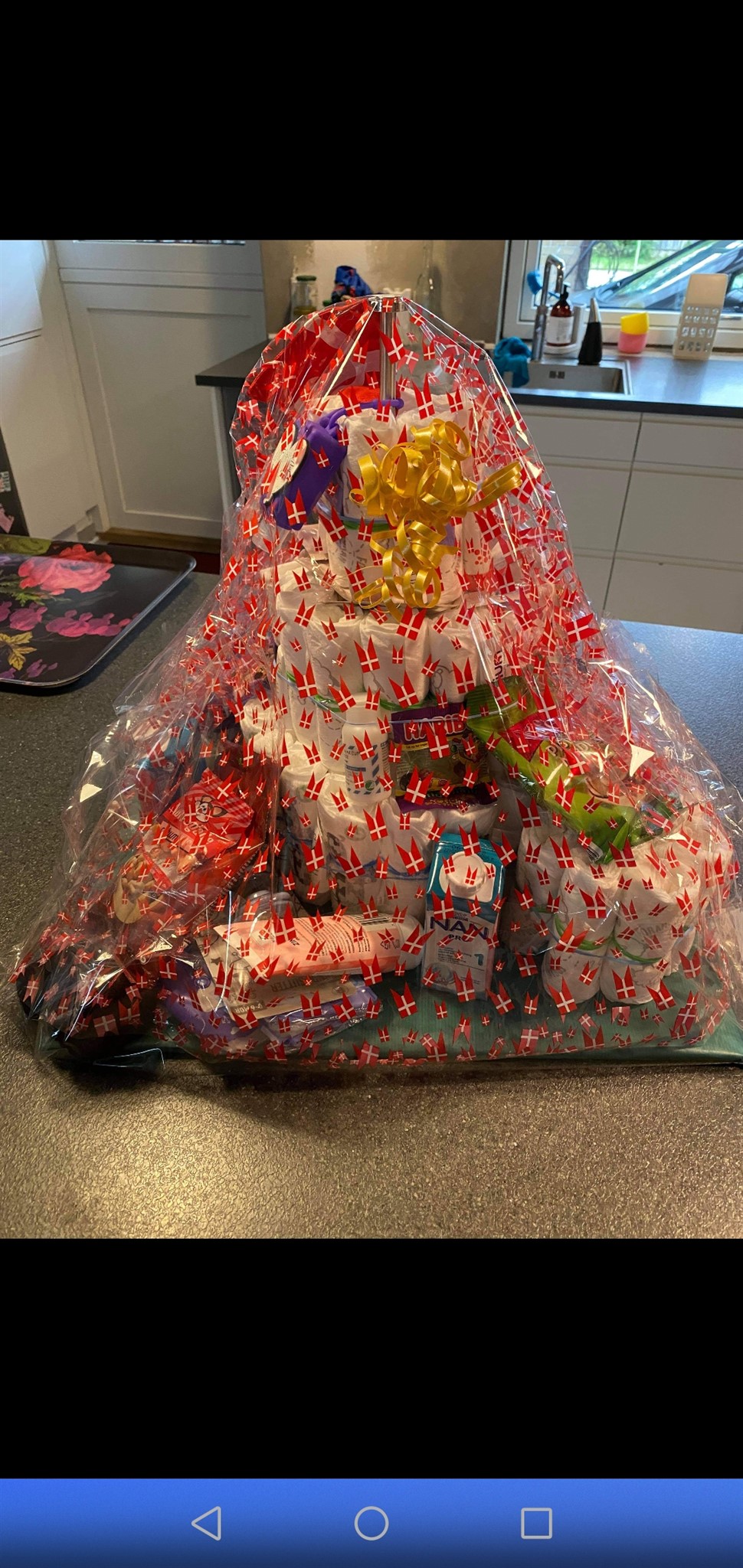 "Kagen" er pyntet med små lækre cremer, til mor og baby, som er stukket ind under elastikkere. Så er der små poser med blandet nødder, tandpasta, 2 kr vingummiposer, ammeindlæg, frys selv mælkeposer, chokolade, mme, 1 lille flaske champagne, kiks, vådservietter, baby tandbørster og tandpasta, extra bleer, og hva jeg ellers lige ku finde på, sat rundt på "kagen" og på "fadet" Der er 56 bleer i alt, i 2 forskellige mærker og str.