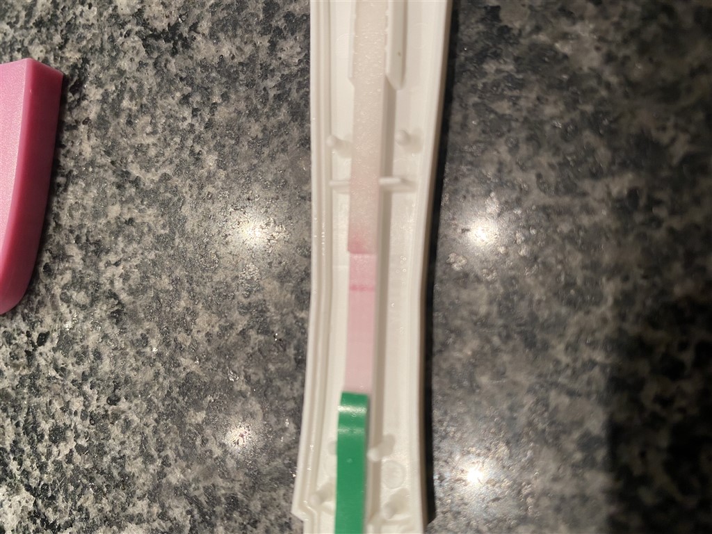 Det er svært helt at se stregen, men der er farve i, det ligner bare at både ved kontrol streg og teststreg er der en lys streg ved siden af og selve testen er meget lyserød.