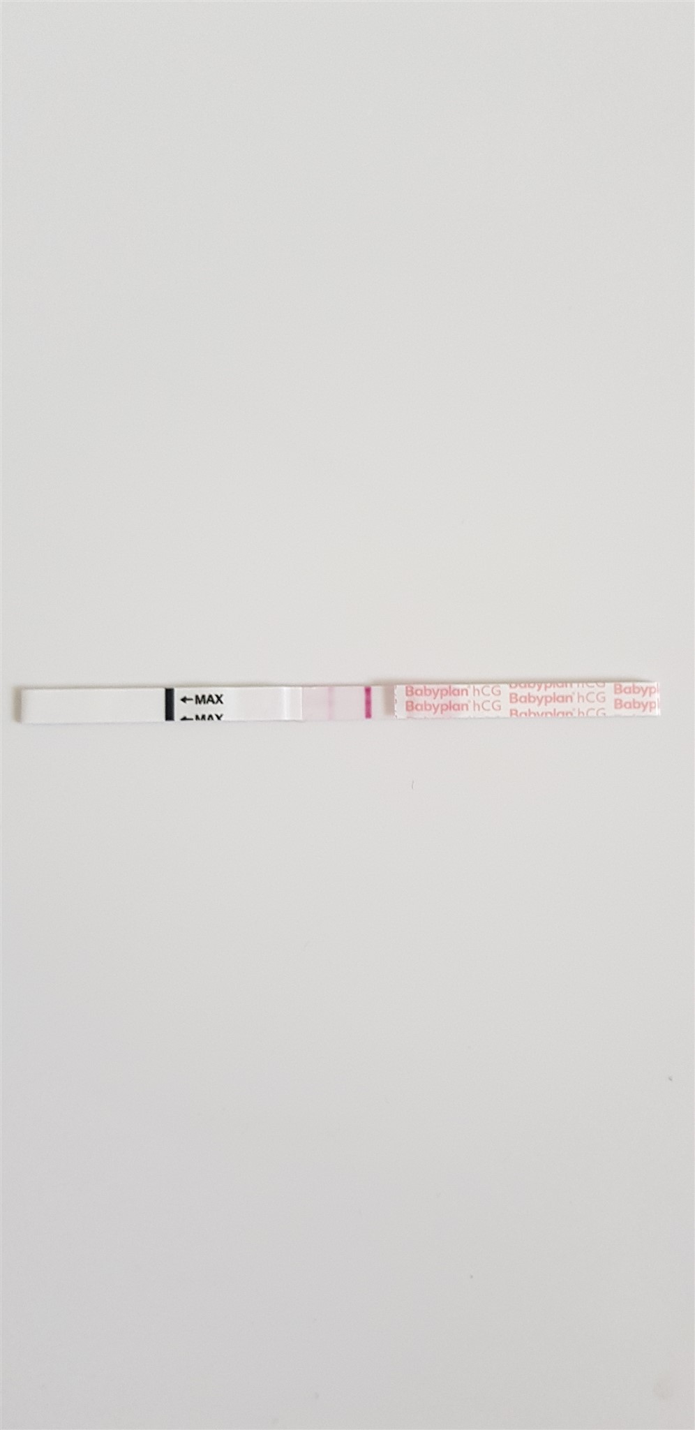 Jeg fik faktisk meget intens kvalme til eftermiddag lige pludselig, fuldstændig som i mine andre graviditeter. Havde den der følelse af "nu er den der" og så testede jeg trods jeg lige havde tisset en halv time tidligere og drukket næsten en liter vand den sidste time op til. Den var svag, men den var der! Og den var synlig i løbet af 1,5 minut. Og jeg forventer først mens på torsdag