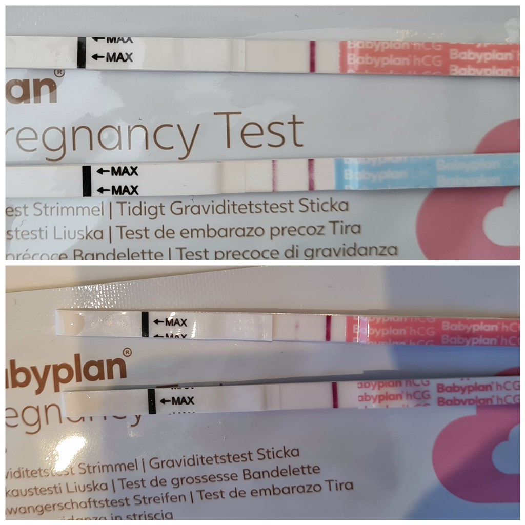 Hmm.. teste fra idag. Øverste morgen, nederste fra nu. Der er også en ultra svag streg på almindelig babyplan men ses ikke på billedet. Men ægløsningstesten er negativ nu, så ved ikke om deter noget