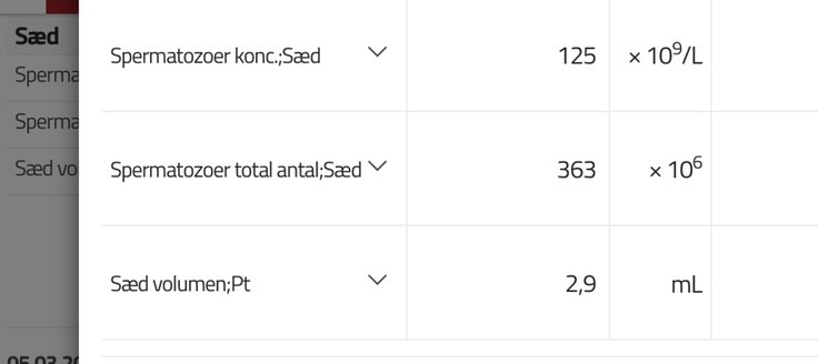 Så din mand ligger til 125 millioner pr. mL sæd han leverer. Det er umiddelbart et flot tal, men du mangler to andre oplysninger - hvor mange procent af disse er levedygtige? Og hvor mange har den rigtige form (så de kan svømme frem osv.).
