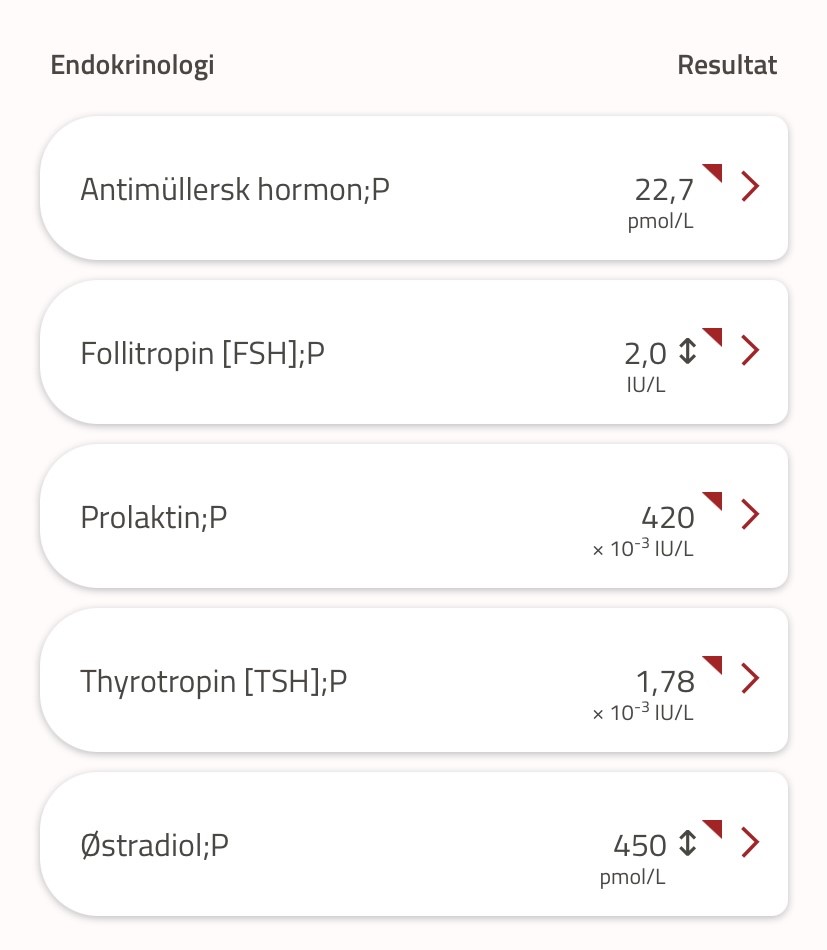Amh siger noget om din ægreserve, og den ser fin ud - et meget lavt tal alt afhængig af alder, indikerer få æg og et meget højt tal indikerer pco, dvs ingen/sjældent naturlig ægløsning.