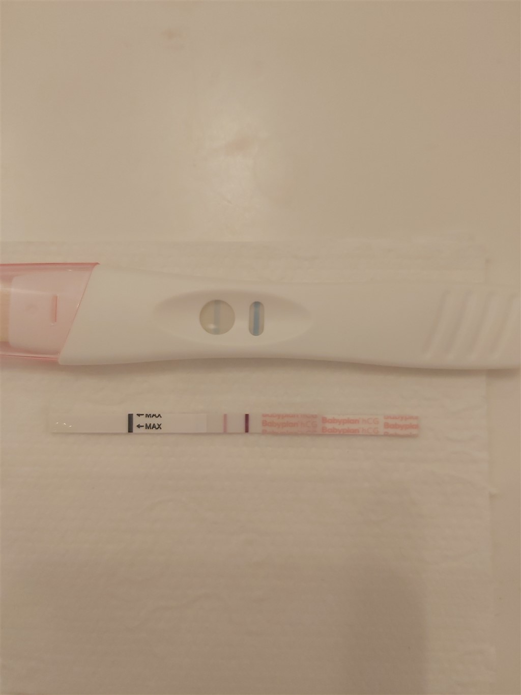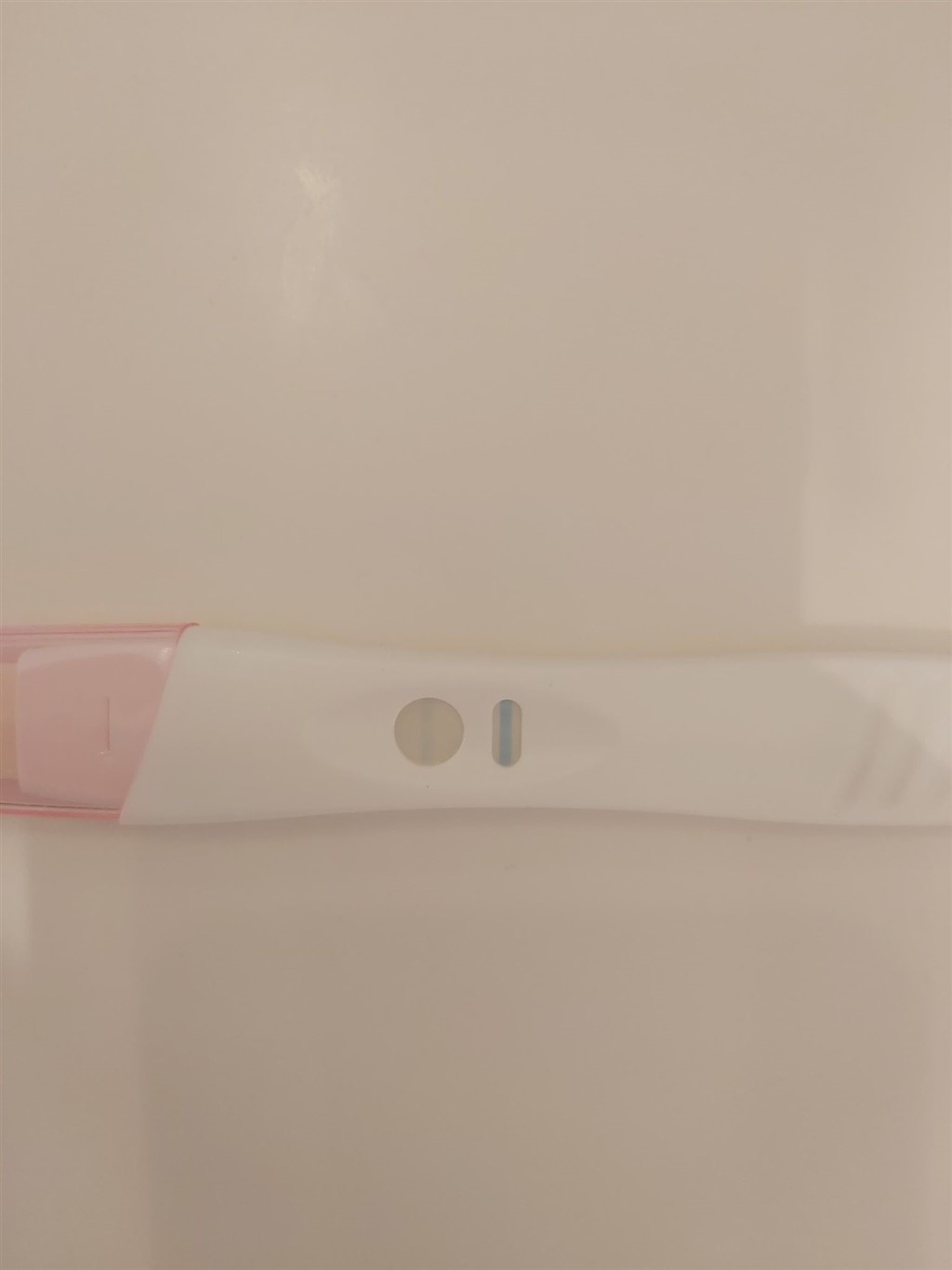 I morgen tog jeg så testen og den var svagt positiv. Hvilket kom meget bag på mig og jeg tør overhovedet ikke være glad. Jeg har taget et billede af testen som jeg har vedhæftet, jeg synes dog at billedet er lidt utaknemmeligt i forhold til hvor positiv jeg oplevede at den var. Jeg vil tro at den var halvt så tydelig som kontrol stegen, jeg var i hvert fald ikke i tvivl. Slet ikke når man har set så mange negative tests.