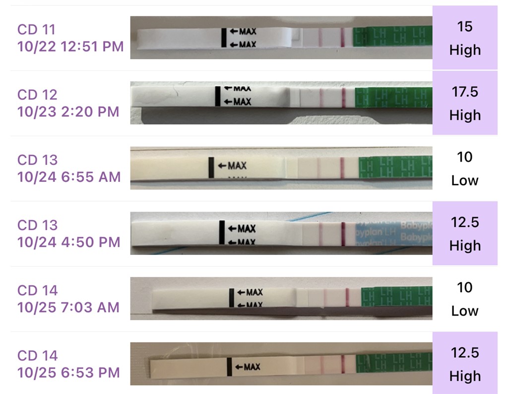 Jeg har kun en enkelt cyklus kunne teste positiv på ægløsningstests. Jeg er nu gået over til at teste to gange om dagen, men har ikke fanget den endnu - og er jo lidt bekymret for at misse den