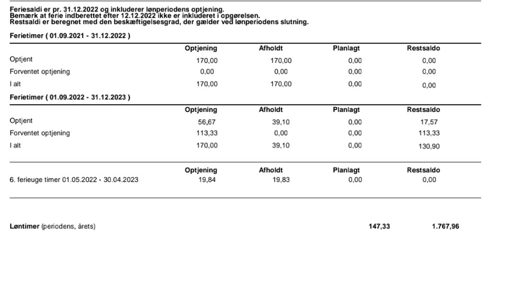 Det ser ud til at du optjener 170 timer om året. Hvilket svarer til 34 timer om ugen i 5 uger. Jeg antager derfor at du arbejder 34 timer om ugen og normalt har 5 ugers ferie på et år.