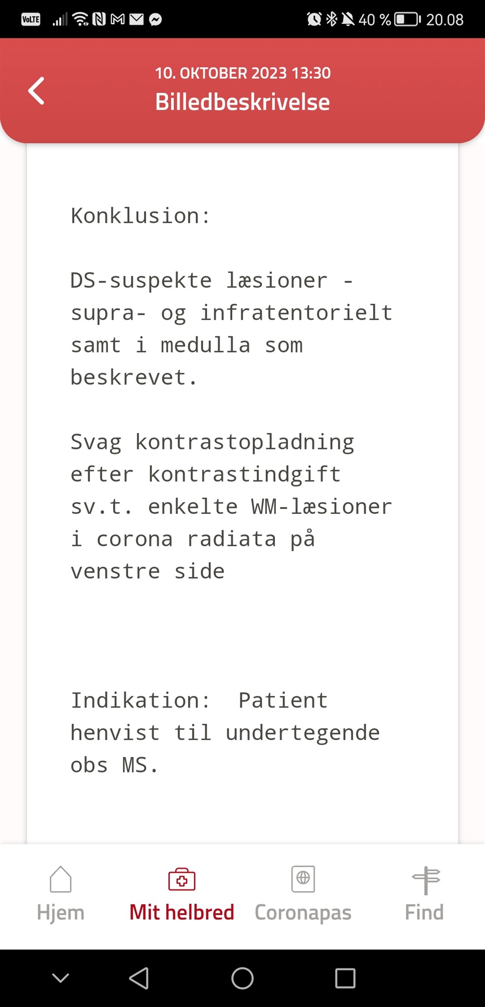 Jeg var i MR scanner i går for tjek for Sclerose, og har allerede fået besked om at lægen ringer på fredag. Derfor ville jeg se om jeg selv kunne se nogen svar, men jeg forstår jo ikke en dyt.
