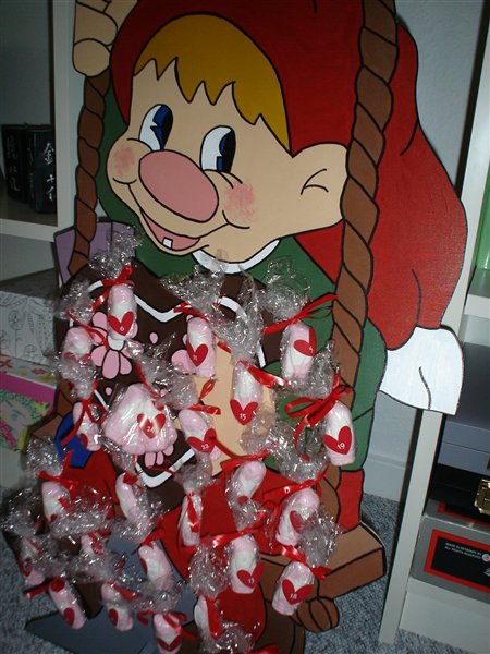 Billede 8: En julekalender min bedste veninde SELV har lavet til Carla. Det er min yndlingsnisse (lavet efter en kravlenisse) og det er mit yndlingsslik der hænger på (og det var til mig. Hi hi)