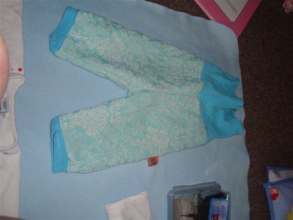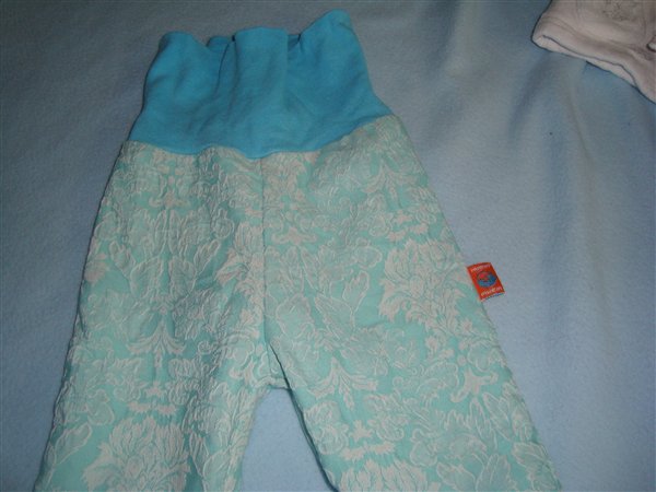 De er en smule nullerede på knæene, men man ser det ikke rigtig pga mønstret i bukserne. Str 68 er jo en alder hvor de kravler så det kan vel ikke forventes andet, men jeg vælger at skrive det så der ikke er tvivl omkring standen
