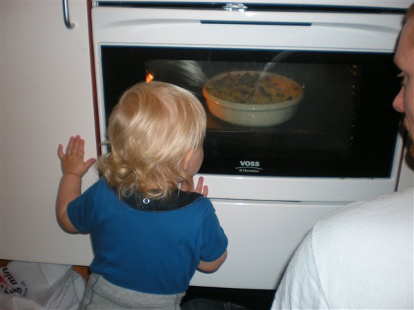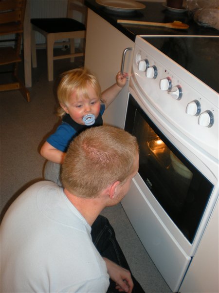 Så her i dag mens Frank begyndte på mad sad vi og legede inde i stuen men Emil endte ude i køkkenet og hjalp far med maden og så holdte de vagt ved ovnen sammen, han vil ikke spise i de her dage men er sjovt at se maden blive fædig han var helt optaget, som i kan se nedenunder.